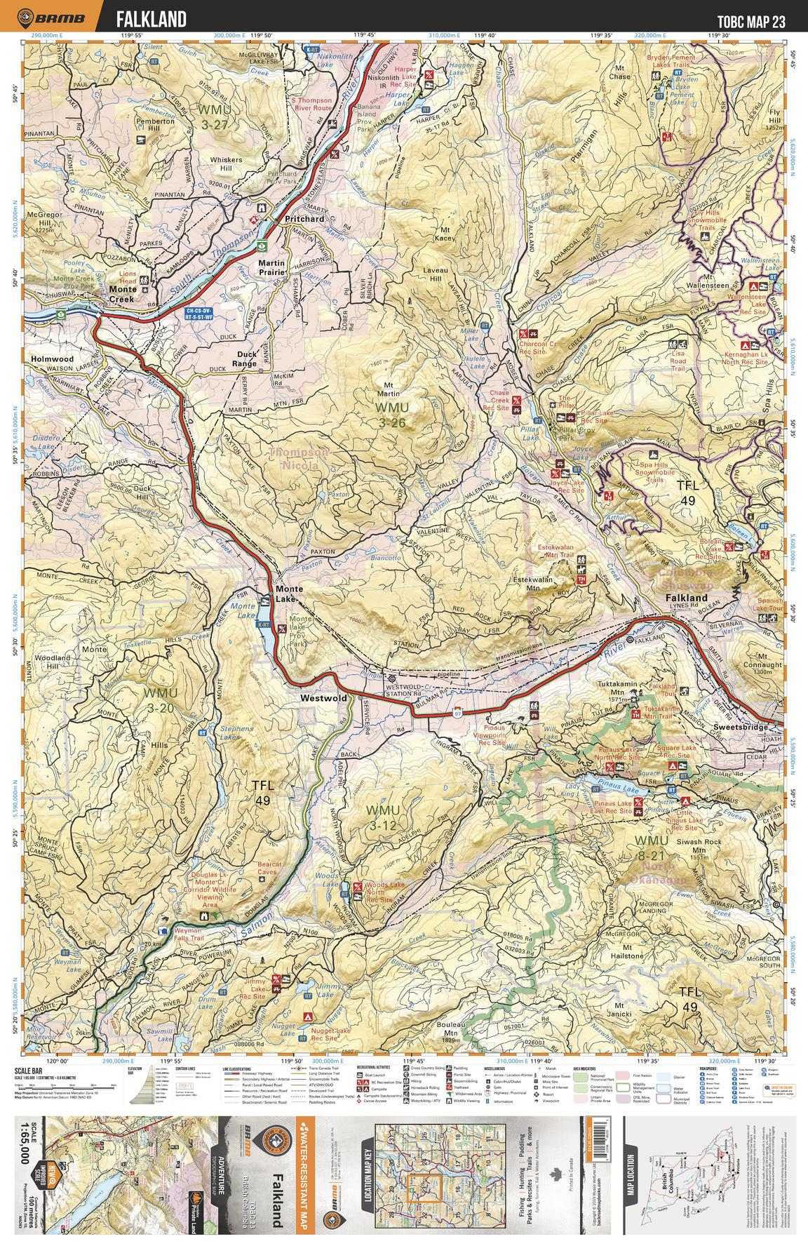 This recreation topographic map for the Falkland area highlights all the logging roads, trails and recreational Points of Interest including hunting, camping, hiking, mountain biking, canoeing, kayaking, backcountry skiing, snowshoeing, cross-country skiing, wildlife viewing, ATVing, snowmobiling and more. No other map for the area provides you with this level of recreational or topographic detail. Special features include private land and countless roads, trails and recreational Points of Interest. Covering 1,950 km2 (750 mi2) in total, this 1:65,000 scale map measures 38 x 51 km (23.5 x 32 mi) and includes Monte Creek, Salmon River, South Thompson River, Pinaus Lake, Monte Lake, Tuktakamin Mountain and more!