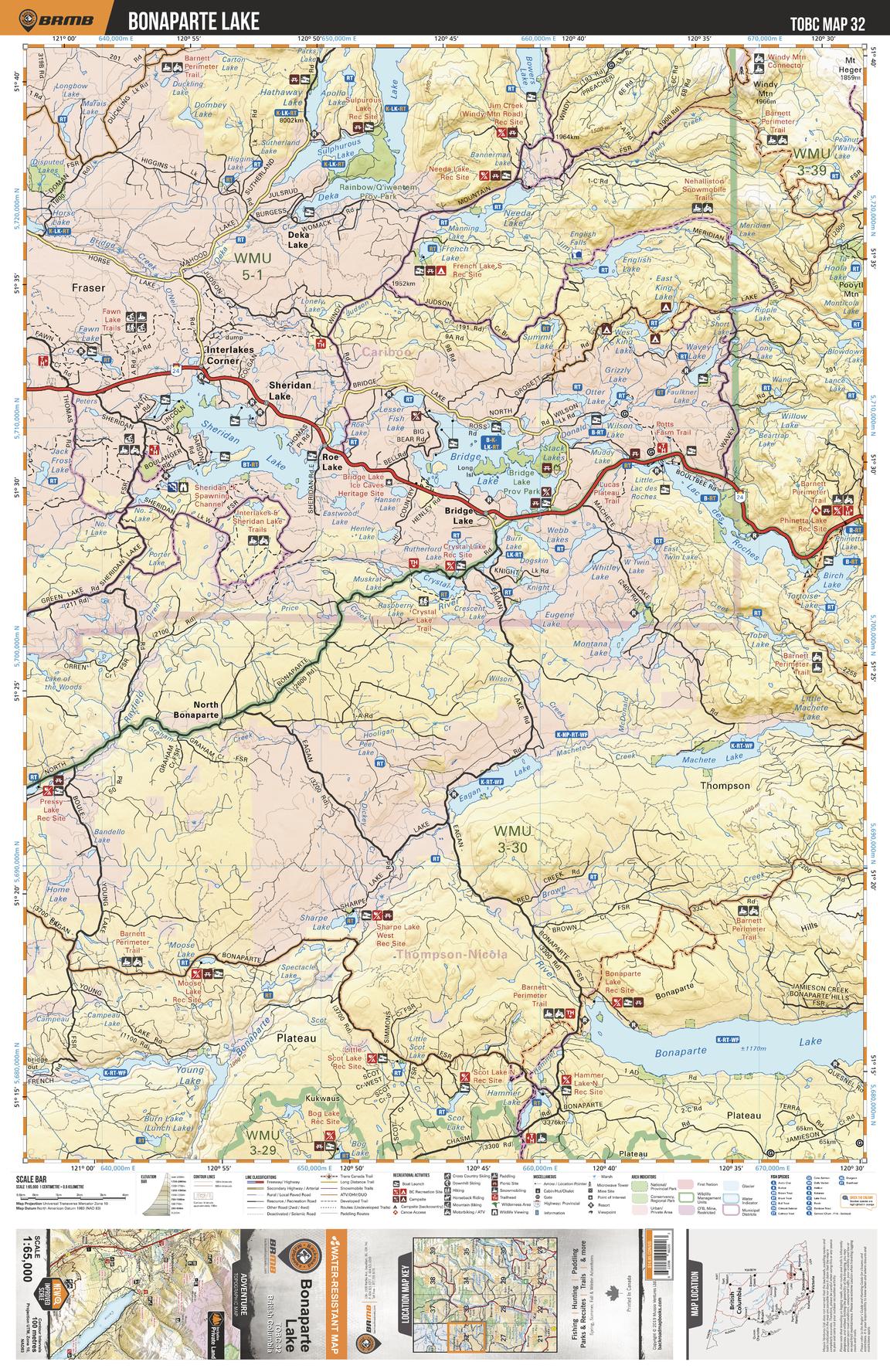 This recreation topographic map for the Bonaparte Lake area highlights all the logging roads, trails and recreational Points of Interest including hunting, camping, hiking, mountain biking, canoeing, kayaking, backcountry skiing, snowshoeing, cross-country skiing, wildlife viewing, ATVing, snowmobiling and more. No other map for the area provides you with this level of recreational or topographic detail. Special features include private land and countless roads, trails and recreational Points of Interest. Covering 1,950 km2 (750 mi2) in total, this 1:65,000 scale map measures 38 x 51 km (23.5 x 32 mi) and includes Bonaparte Lake, Eagan Lake, Machete Lake, Sheridan Lake, Bridge Lake, Deka Lake, Sulphurous Lake, Apollo Lake and more!