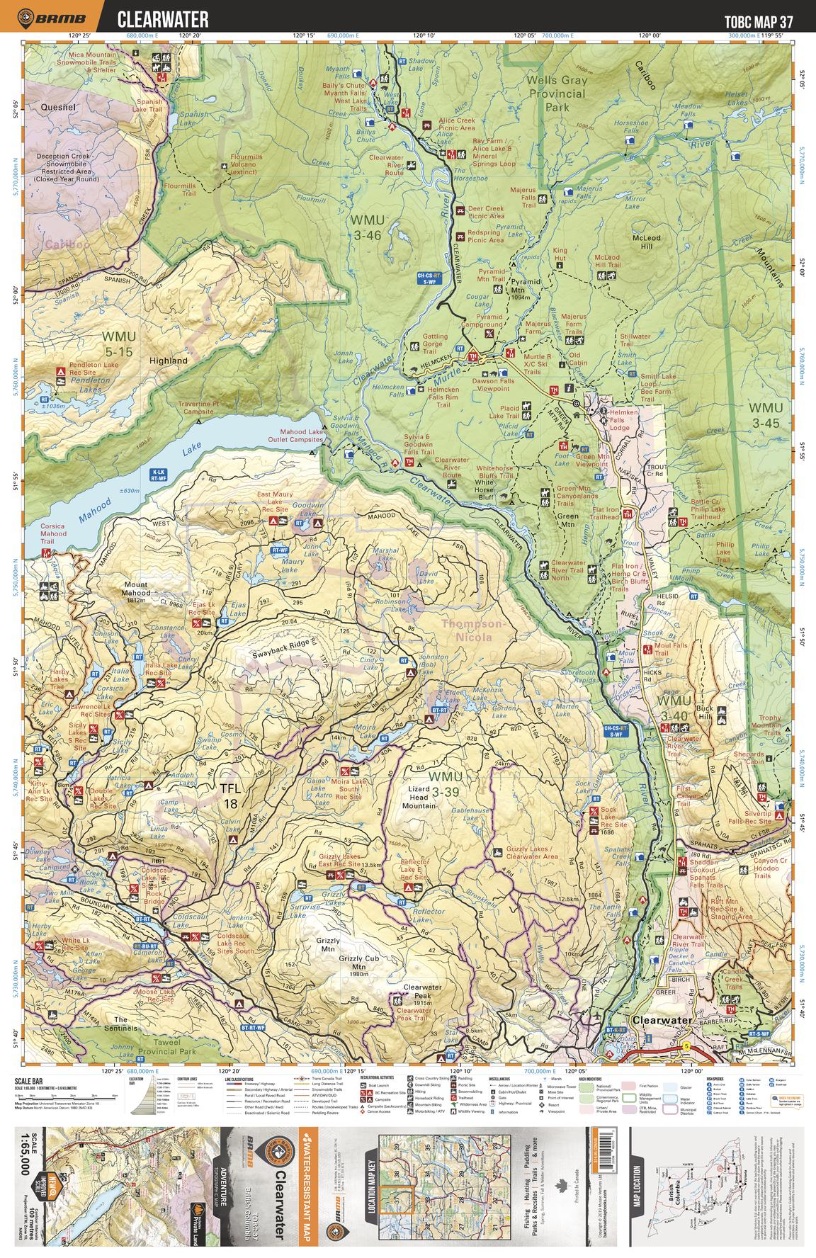 This recreation topographic map for the Clearwater area highlights all the logging roads, trails and recreational Points of Interest including hunting, camping, hiking, mountain biking, canoeing, kayaking, backcountry skiing, snowshoeing, cross-country skiing, wildlife viewing, ATVing, snowmobiling and more. No other map for the area provides you with this level of recreational or topographic detail. Special features include private land and countless roads, trails and recreational Points of Interest. Covering 1,950 km2 (750 mi2) in total, this 1:65,000 scale map measures 38 x 51 km (23.5 x 32 mi) and includes Clearwater, Mahood Lake, Clearwater River, Mahood River, Spanish Lake, Pendelton Lakes, Reflector Lake, Wells Gray Provincial Park and more!