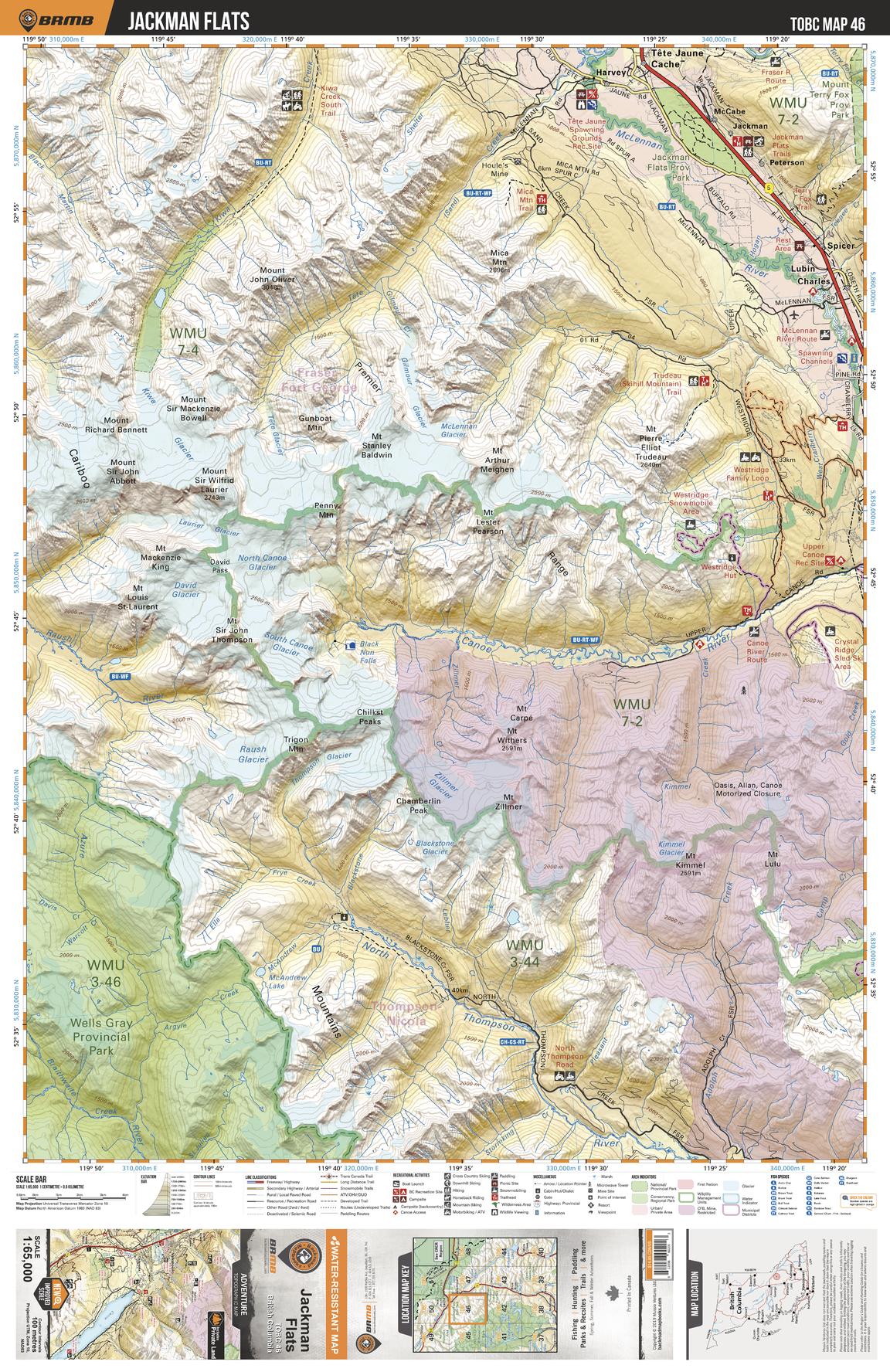 This recreation topographic map for the Jackman Flats area highlights all the logging roads, trails and recreational Points of Interest including hunting, camping, hiking, mountain biking, canoeing, kayaking, backcountry skiing, snowshoeing, cross-country skiing, wildlife viewing, ATVing, snowmobiling and more. No other map for the area provides you with this level of recreational or topographic detail. Special features include private land and countless roads, trails and recreational Points of Interest. Covering 1,950 km2 (750 mi2) in total, this 1:65,000 scale map measures 38 x 51 km (23.5 x 32 mi) and includes Jackman Flats, McLennan River, Canoe River, North Thompson River, Jackman Flats Provincial Park, Kiwa Creek and more!