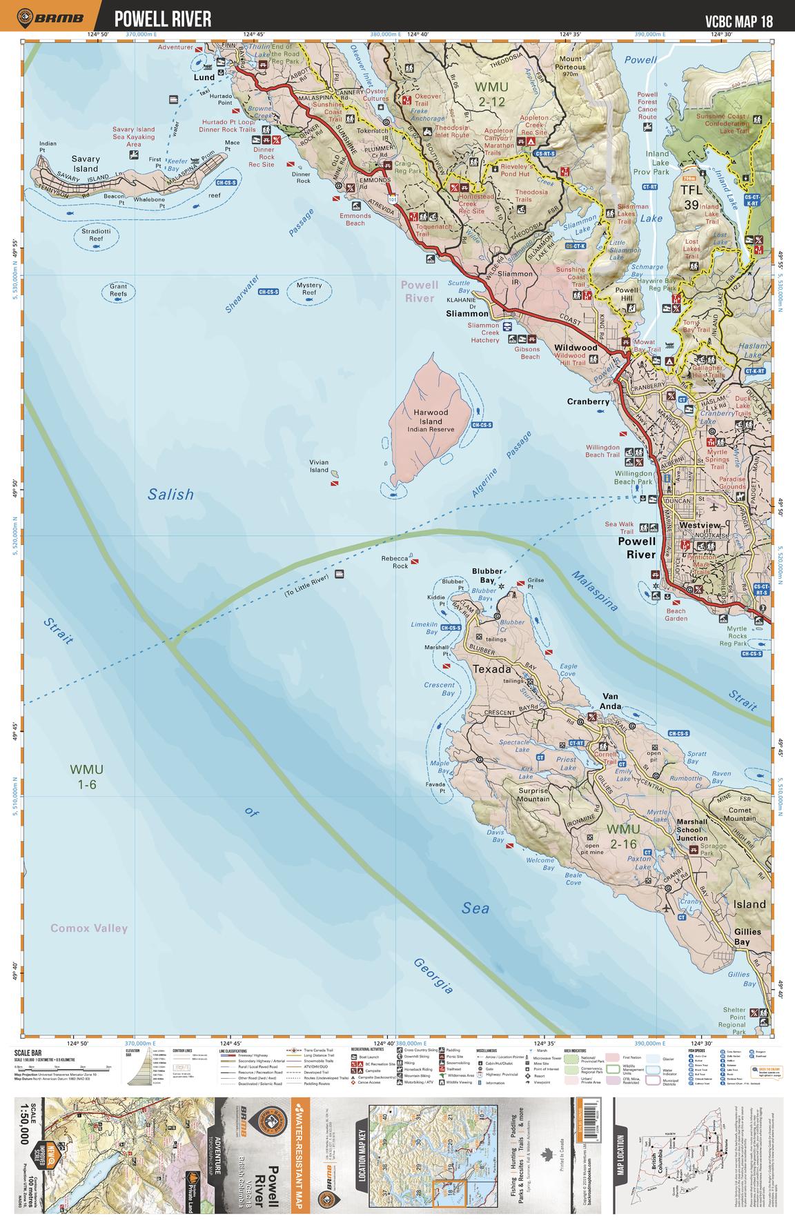 This recreation topographic map for the Powell River area highlights all the logging roads, trails and recreational Points of Interest including hunting, camping, hiking, mountain biking, canoeing, kayaking, backcountry skiing, wildlife viewing, ATVing, snowmobiling and more. No other map for the area provides you with this level of recreational or topographic detail. Covering 1,090 km2 (420 mi2), this 1:50,000 scale map measures 29 x 38 km (18 x 24 mi) and covers Powell River, Powell Lake, Sliammon Lake, Inland Lake, Inland Lake Provincial Park, Priest Lake, Okeover Arm Provincial Park and more!