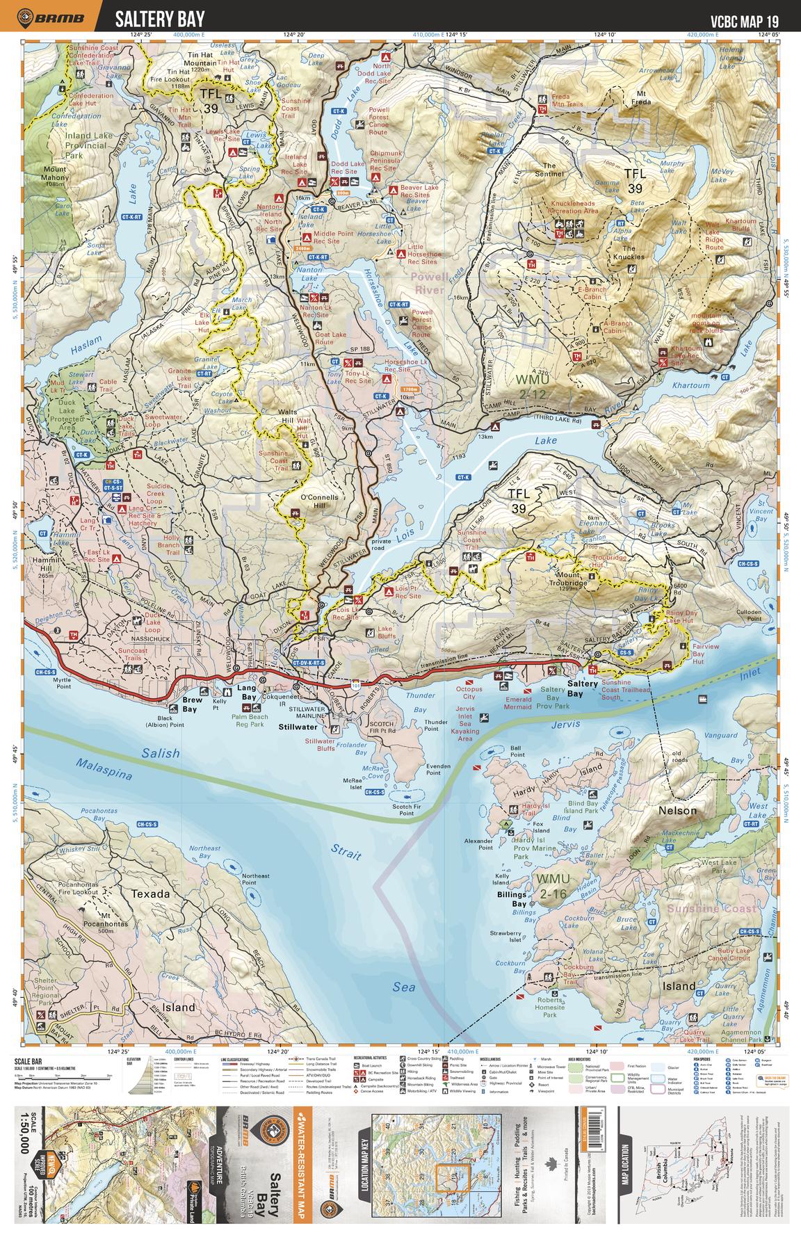 This recreation topographic map for the Saltery Bay area highlights all the logging roads, trails and recreational Points of Interest including hunting, camping, hiking, mountain biking, canoeing, kayaking, backcountry skiing, wildlife viewing, ATVing, snowmobiling and more. No other map for the area provides you with this level of recreational or topographic detail. Covering 1,090 km2 (420 mi2), this 1:50,000 scale map measures 29 x 38 km (18 x 24 mi) and covers Saltery Bay, Lois Lake, Khartoum Lake, Haslam Lake, Inland Lake Provicnial Park, Saltery Bay Provincial Park, Sunshine Coast Trail and more!