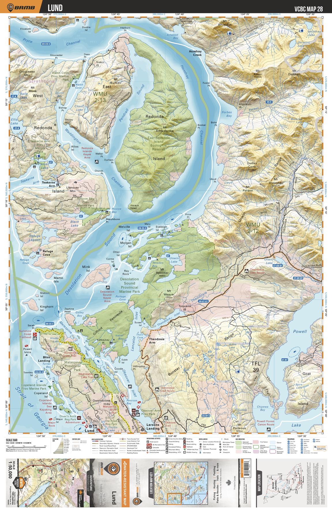 This recreation topographic map for the Lund area highlights all the logging roads, trails and recreational Points of Interest including hunting, camping, hiking, mountain biking, canoeing, kayaking, backcountry skiing, wildlife viewing, ATVing, snowmobiling and more. No other map for the area provides you with this level of recreational or topographic detail. Covering 1,090 km2 (420 mi2), this 1:50,000 scale map measures 29 x 38 km (18 x 24 mi) and covers Lund, Desolation Sound Provincial Marine Park, Powell Lake, East Redona Island Ecological Reserve, Walsh Cove Provincial Marine Park and more!