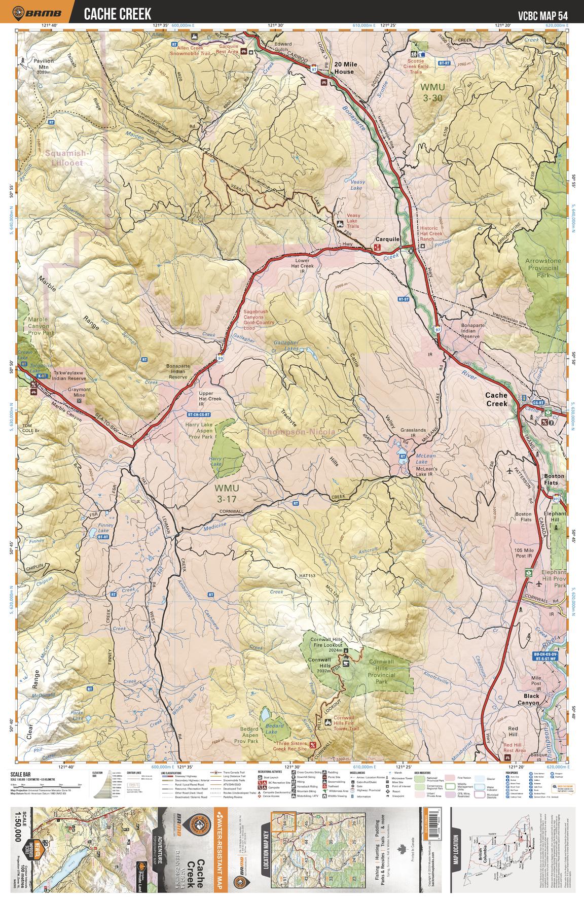 This recreation topographic map for the Cache Creek area highlights all the logging roads, trails and recreational Points of Interest including hunting, camping, hiking, mountain biking, canoeing, kayaking, backcountry skiing, wildlife viewing, ATVing, snowmobiling and more. No other map for the area provides you with this level of recreational or topographic detail. Covering 1,090 km2 (420 mi2), this 1:50,000 scale map measures 29 x 38 km (18 x 24 mi) and covers Cache Creek, Cornwall Hills Provincial Park, Harry Lake Aspen Provincial Park, Bonaparte River, Bedard Aspen Provincial Park and more!