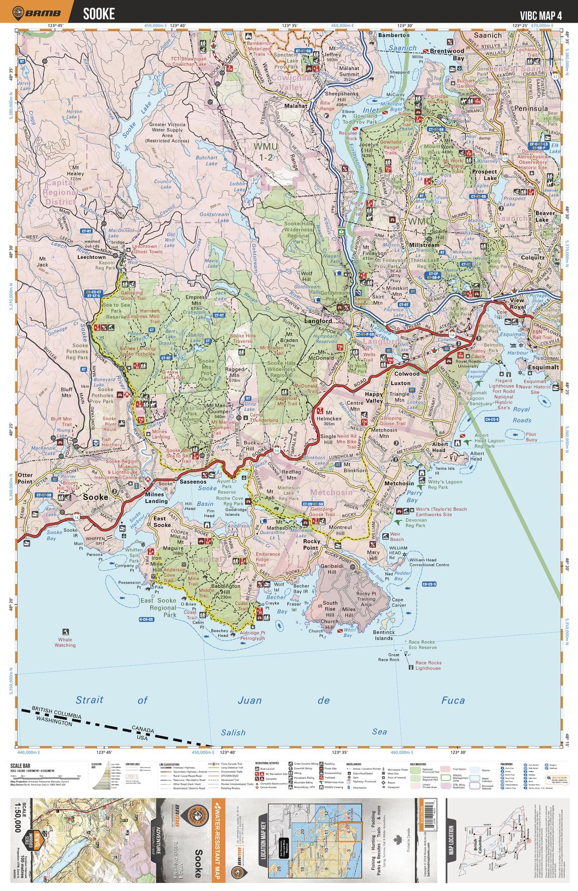 This recreation topographic map for Sooke highlights all the logging roads, trails and recreational Points of Interest including hunting, camping, hiking, mountain biking, canoeing, kayaking, backcountry skiing, wildlife viewing, ATVing, snowmobiling and more. No other map for the area provides you with this level of recreational or topographic detail. Covering 1,090 km2 (420 mi2) in total, this 1:50,000 scale map measures 29 x 38 km (18 x 24 mi) and covers Sooke, Sea to Sea Park Reserve, Sooke Hills Wilderness Provincial Park, East Sooke Regional Park, Esquimalt and more!