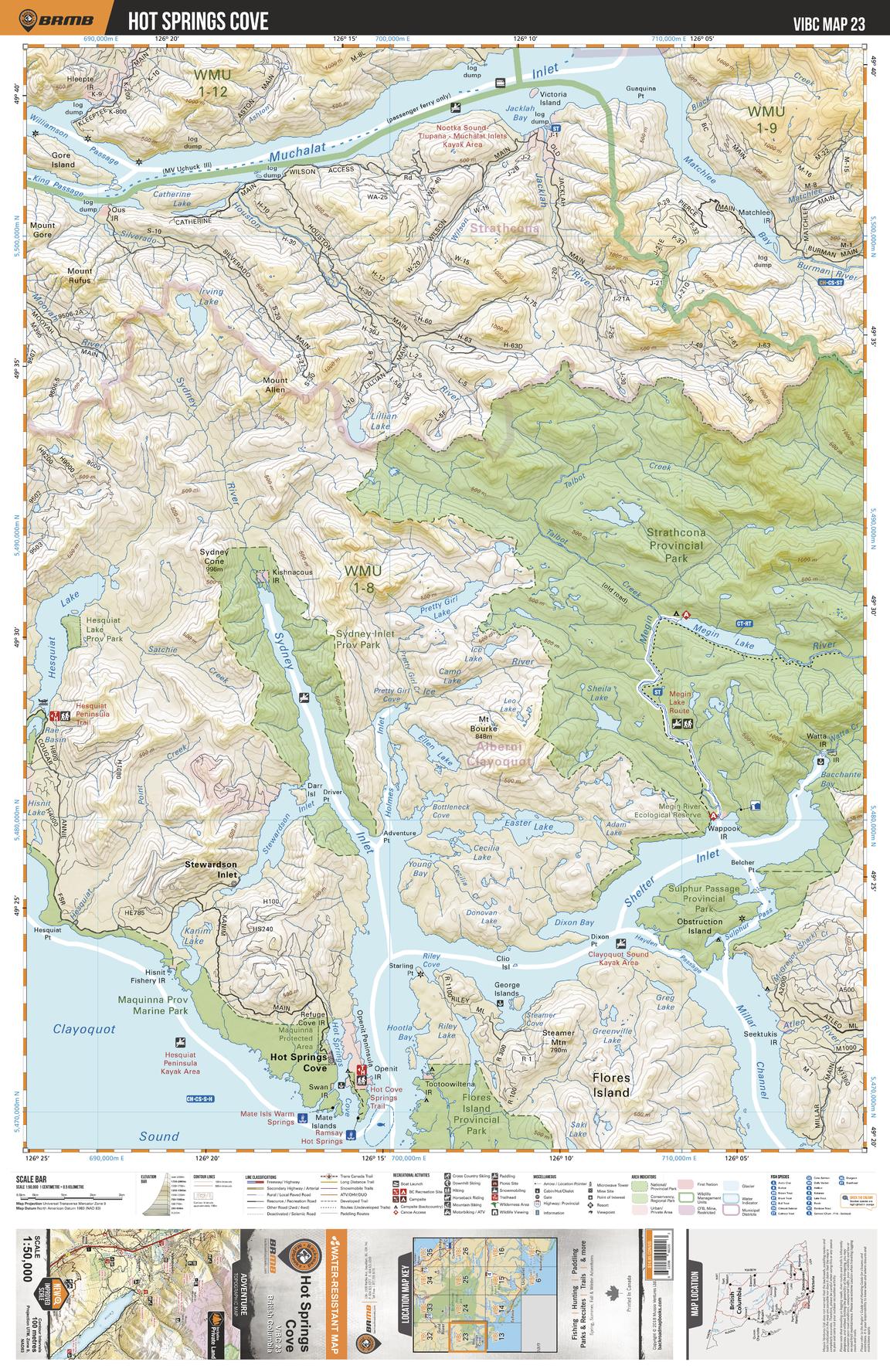 This recreation topographic map for Hot Springs Cove highlights all the logging roads, trails and recreational Points of Interest including hunting, camping, hiking, mountain biking, canoeing, kayaking, backcountry skiing, wildlife viewing, ATVing, snowmobiling and more. No other map for the area provides you with this level of recreational or topographic detail. Covering 1,090 km2 (420 mi2) in total, this 1:50,000 scale map measures 29 x 38 km (18 x 24 mi) and covers Hot Springs Cove, Flores Island Provincial Park, Sydney Inlet, Shelter Inlet, Sydney Inlet Provincial Park, Strathcona Provincial Park and more!