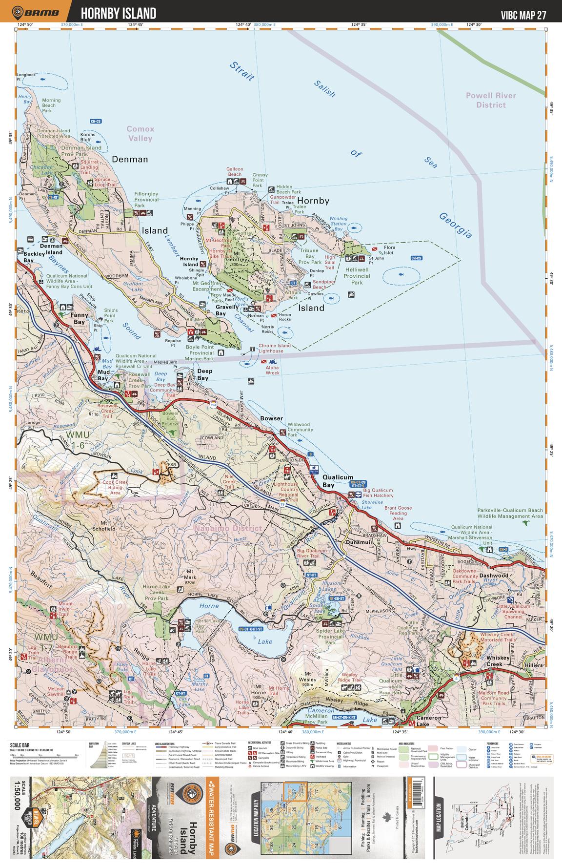 This recreation topographic map for Hornby Island highlights all the logging roads, trails and recreational Points of Interest including hunting, camping, hiking, mountain biking, canoeing, kayaking, backcountry skiing, wildlife viewing, ATVing, snowmobiling and more. No other map for the area provides you with this level of recreational or topographic detail. Covering 1,090 km2 (420 mi2) in total, this 1:50,000 scale map measures 29 x 38 km (18 x 24 mi) and covers Hornby Island, Denman Island, Boyle Point Provincial Marine Park, Horne Lake, Cameron Lake, Qualicum River, Little Qulicum Falls Provincial Park and more!