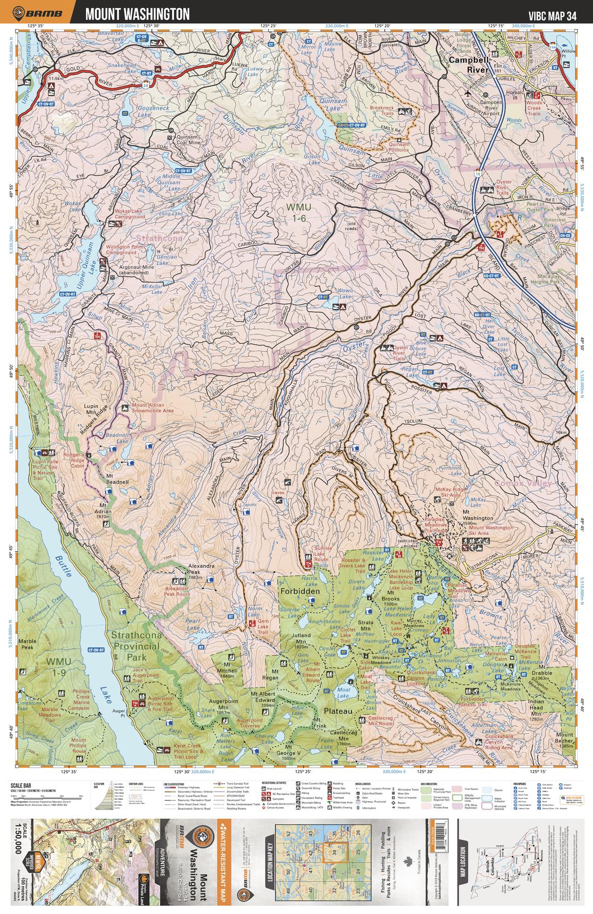 This recreation topographic map for Mount Washington highlights all the logging roads, trails and recreational Points of Interest including hunting, camping, hiking, mountain biking, canoeing, kayaking, backcountry skiing, wildlife viewing, ATVing, snowmobiling and more. No other map for the area provides you with this level of recreational or topographic detail. Covering 1,090 km2 (420 mi2) in total, this 1:50,000 scale map measures 29 x 38 km (18 x 24 mi) and covers Mount Washington, Oyster River, Upper Quinsam Lake, Buttle Lake, Strathcona Provincial Park, Pearl Lake, Moat Lake and more!