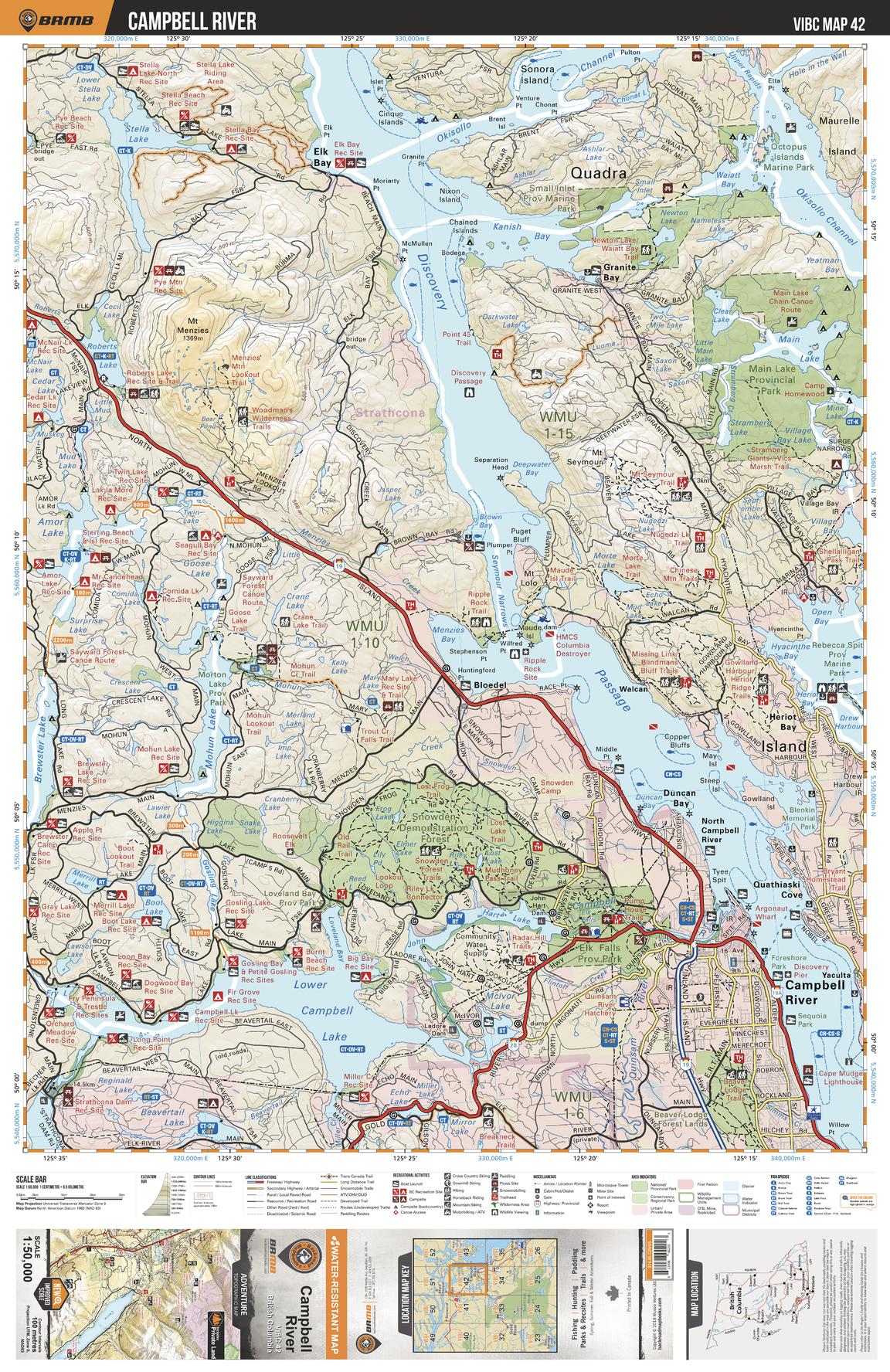 This recreation topographic map for Campbell River highlights all the logging roads, trails and recreational Points of Interest including hunting, camping, hiking, mountain biking, canoeing, kayaking, backcountry skiing, wildlife viewing, ATVing, snowmobiling and more. No other map for the area provides you with this level of recreational or topographic detail. Covering 1,090 km2 (420 mi2) in total, this 1:50,000 scale map measures 29 x 38 km (18 x 24 mi) and covers Campbell River, Discovery Passage, Main Lake Provincial Park, Small Inlet Provincial Park, Snowden Demonstration Forest and more!