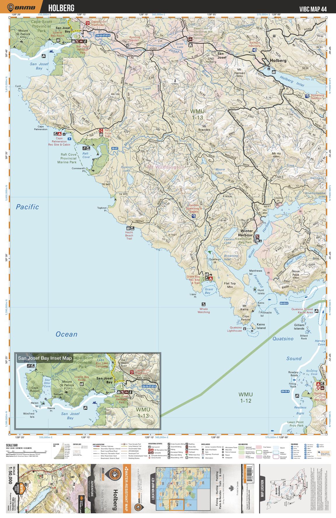 This recreation topographic map for Holberg highlights all the logging roads, trails and recreational Points of Interest including hunting, camping, hiking, mountain biking, canoeing, kayaking, backcountry skiing, wildlife viewing, ATVing, snowmobiling and more. No other map for the area provides you with this level of recreational or topographic detail. Covering 1,090 km2 (420 mi2) in total, this 1:50,000 scale map measures 29 x 38 km (18 x 24 mi) and covers Holdberg, Cape Scott Provincial Park, Raft Cove Provincial Marine Park, Macjack River, Winter Harbour, Holberg Inlet and more!
