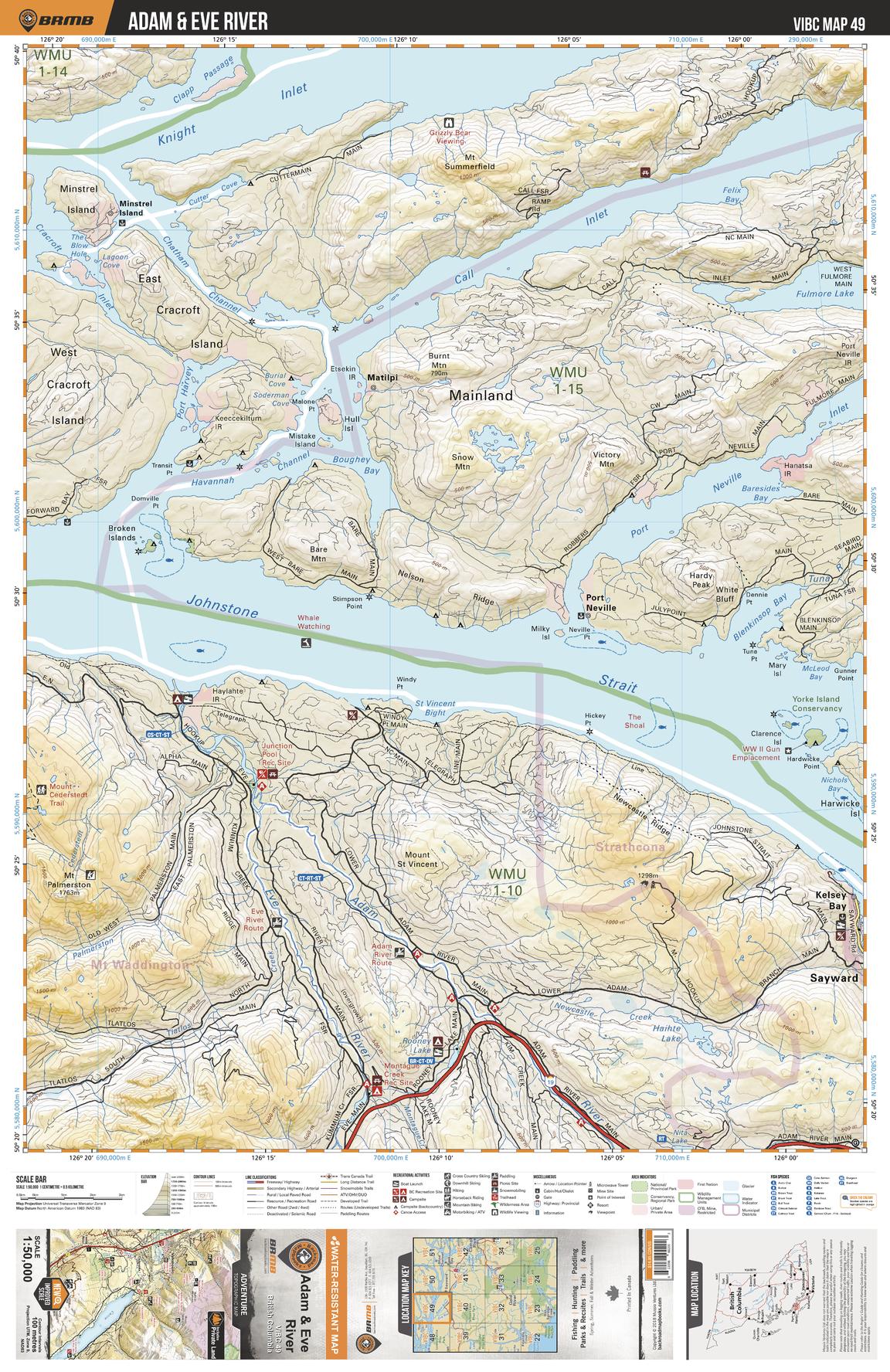 This recreation topographic map for Adam and Eve River highlights all the logging roads, trails and recreational Points of Interest including hunting, camping, hiking, mountain biking, canoeing, kayaking, backcountry skiing, wildlife viewing, ATVing, snowmobiling and more. No other map for the area provides you with this level of recreational or topographic detail. Covering 1,090 km2 (420 mi2) in total, this 1:50,000 scale map measures 29 x 38 km (18 x 24 mi) and covers Adam And Eve River, Knight Inlet, Call Inlet, Port Neville, Johnstone Strait, Kelsey Bay, Sayward and more!