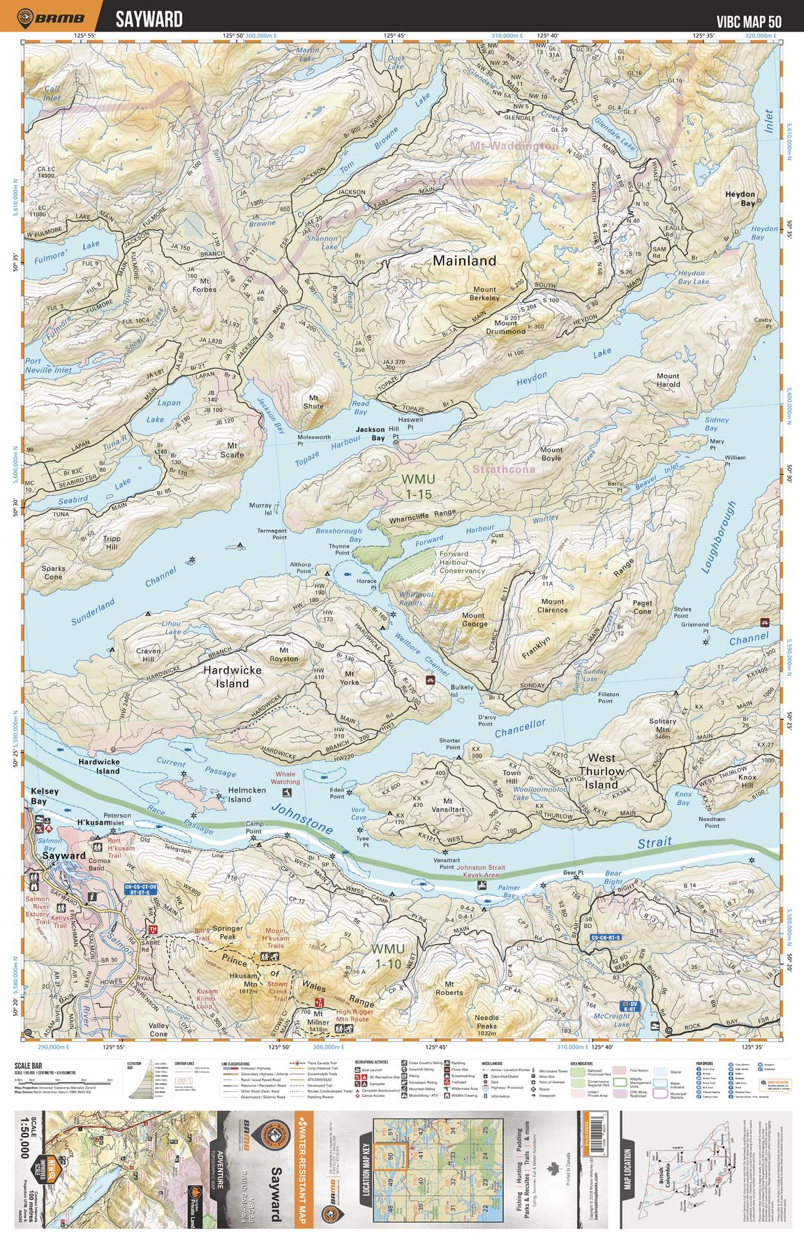 This recreation topographic map for Sayward highlights all the logging roads, trails and recreational Points of Interest including hunting, camping, hiking, mountain biking, canoeing, kayaking, backcountry skiing, wildlife viewing, ATVing, snowmobiling and more. No other map for the area provides you with this level of recreational or topographic detail. Covering 1,090 km2 (420 mi2) in total, this 1:50,000 scale map measures 29 x 38 km (18 x 24 mi) and covers Sayward, Tom Browne Lake, Seabird Lake, Heydon Lake, Salmon River, Woolloompoloo Lake, Hardwicke Island and more!
