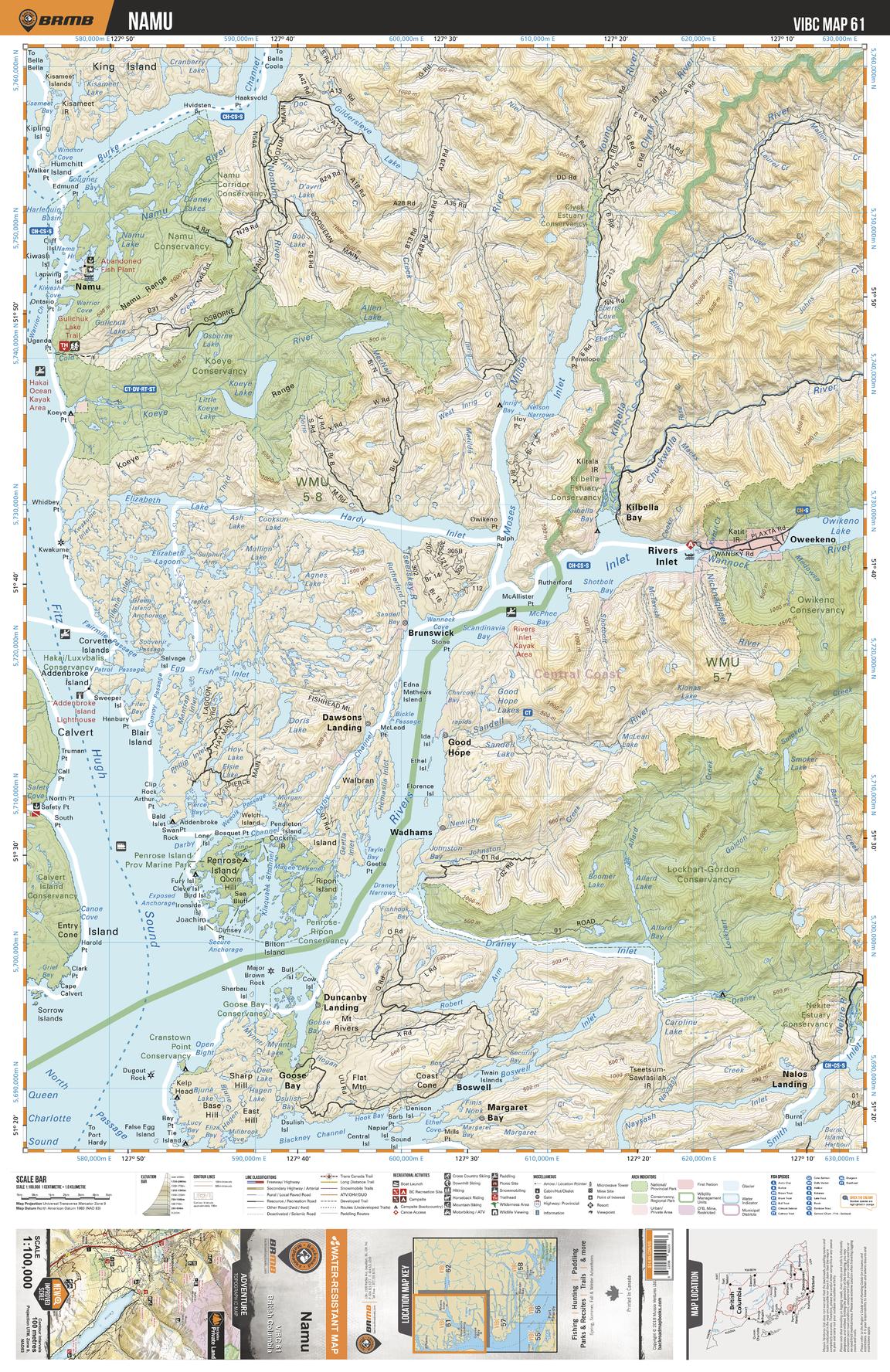 This recreation topographic map for Namu highlights all the logging roads, trails and recreational Points of Interest including hunting, camping, hiking, mountain biking, canoeing, kayaking, backcountry skiing, wildlife viewing, ATVing, snowmobiling and more. No other map for the area provides you with this level of recreational or topographic detail. Covering 4,315 km2 (1,665 mi2) in total, 1:100,000 scale map measures 57 x 75 km (35 x 46.5 mi) and covers Namu, Namu Conservancy, Koeye Conservancy, Owikeno Lake, Gildersleve Lake, Young River, Clyak River, Kibella River more!