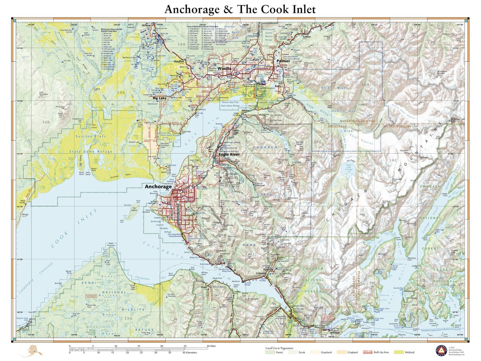 This wall map details the terrain in Alaska’s most populated area. Coverage includes Anchorage, Palmer, Wasilla, the Knik & Turnagain Arms of Cook Inlet, peaks and glaciers of the Chugach Mountains, the fjords of Port Wells and the western reaches of Prince William Sound.