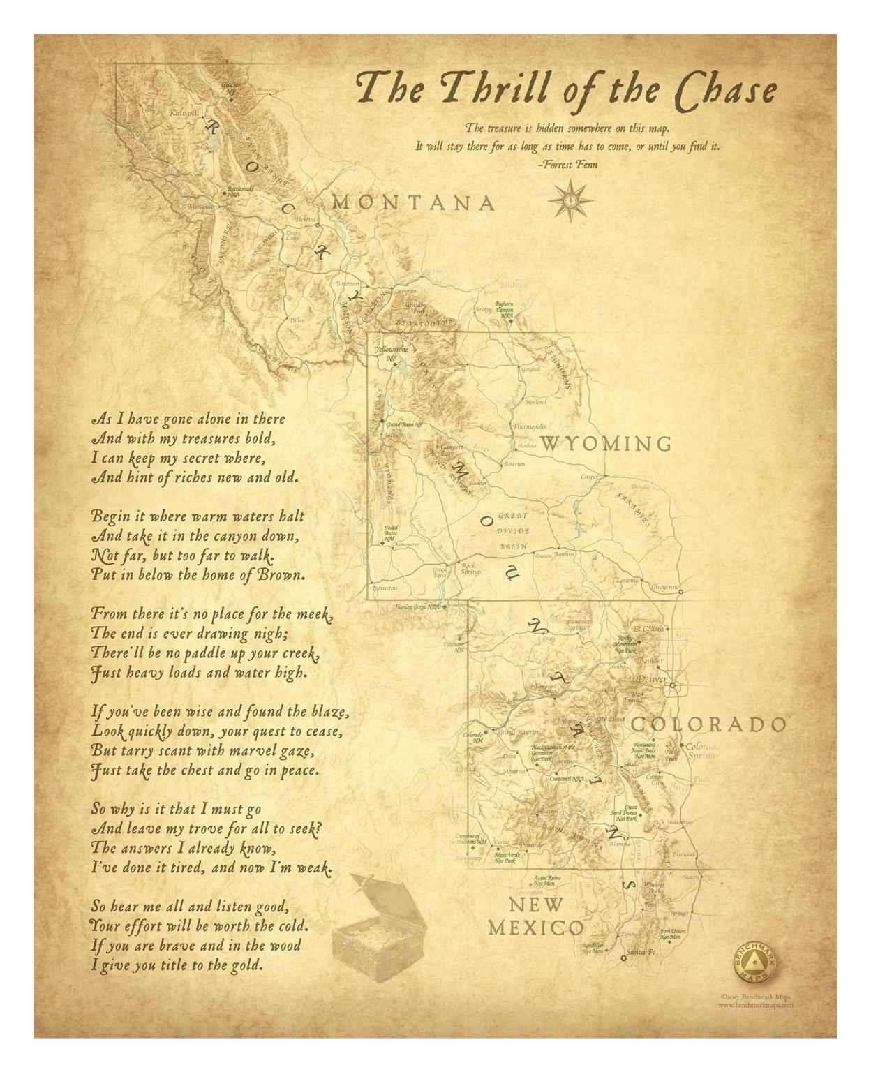 This wall map illustrates the searchable area for Forrest Fenn’s famous treasure chest. Our map first appeared as a fold-out in Forrest’s 2013 memoir Too Far To Walk. His treasure was found in the spring of 2020 at an undisclosed location in Wyoming. Within a few months Forrest passed away at his home in Santa Fe, New Mexico. We keep this map available as a keepsake for those who experienced the Thrill of the Chase.