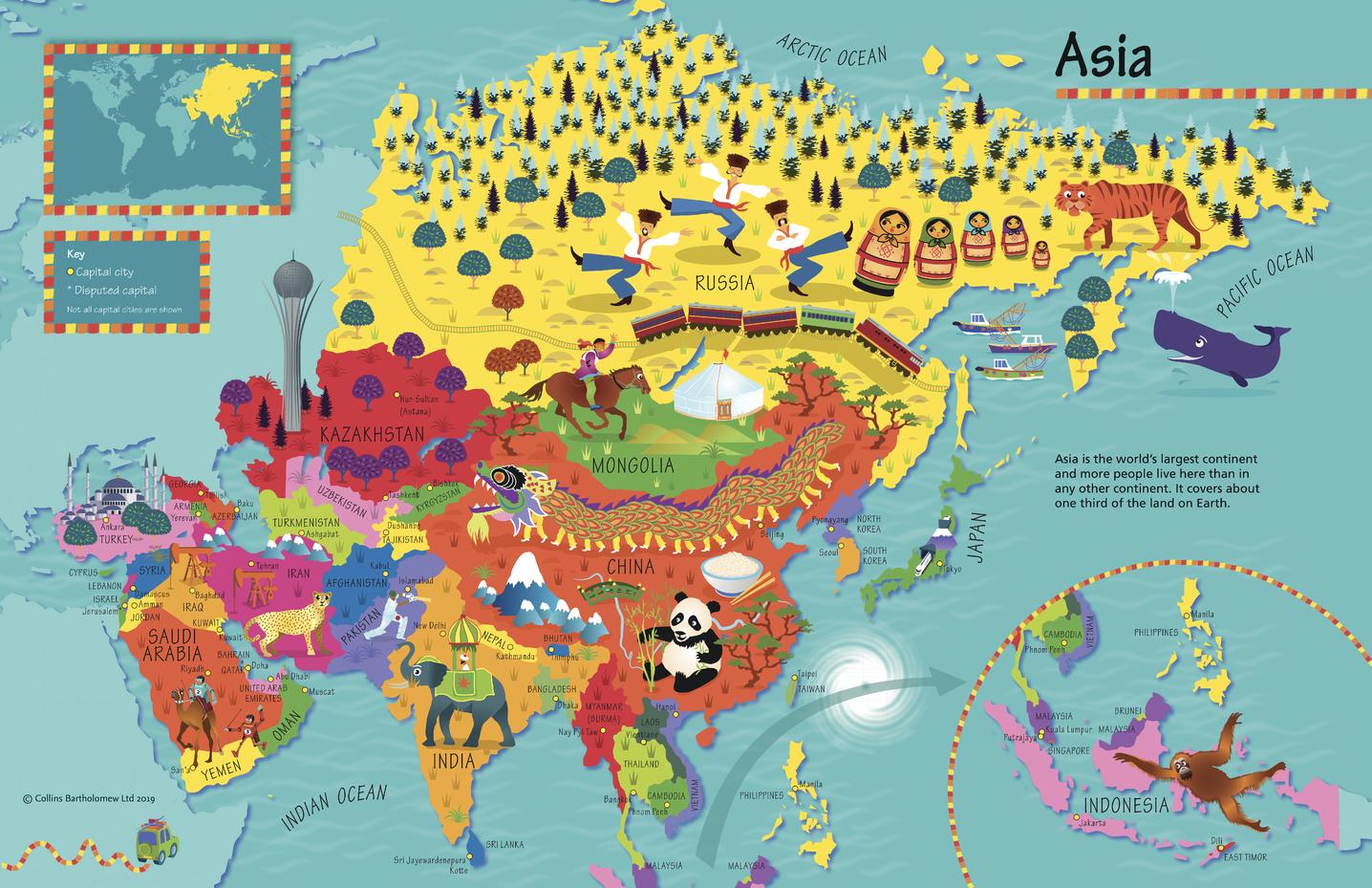 This highly illustrated pictorial map is designed to take children on a journey of discovery around the countries of Asia. The mapping is clear, colourful and highly informative and shows countries and capital cities. Stunning illustrations are used to depict themes such as national emblems, customs, food, birds, animals, buildings and sports to help younger readers gain an understanding of peoples around the world. The perfect introduction to maps for 4-8 year olds. Illustrated by Steve Evans.