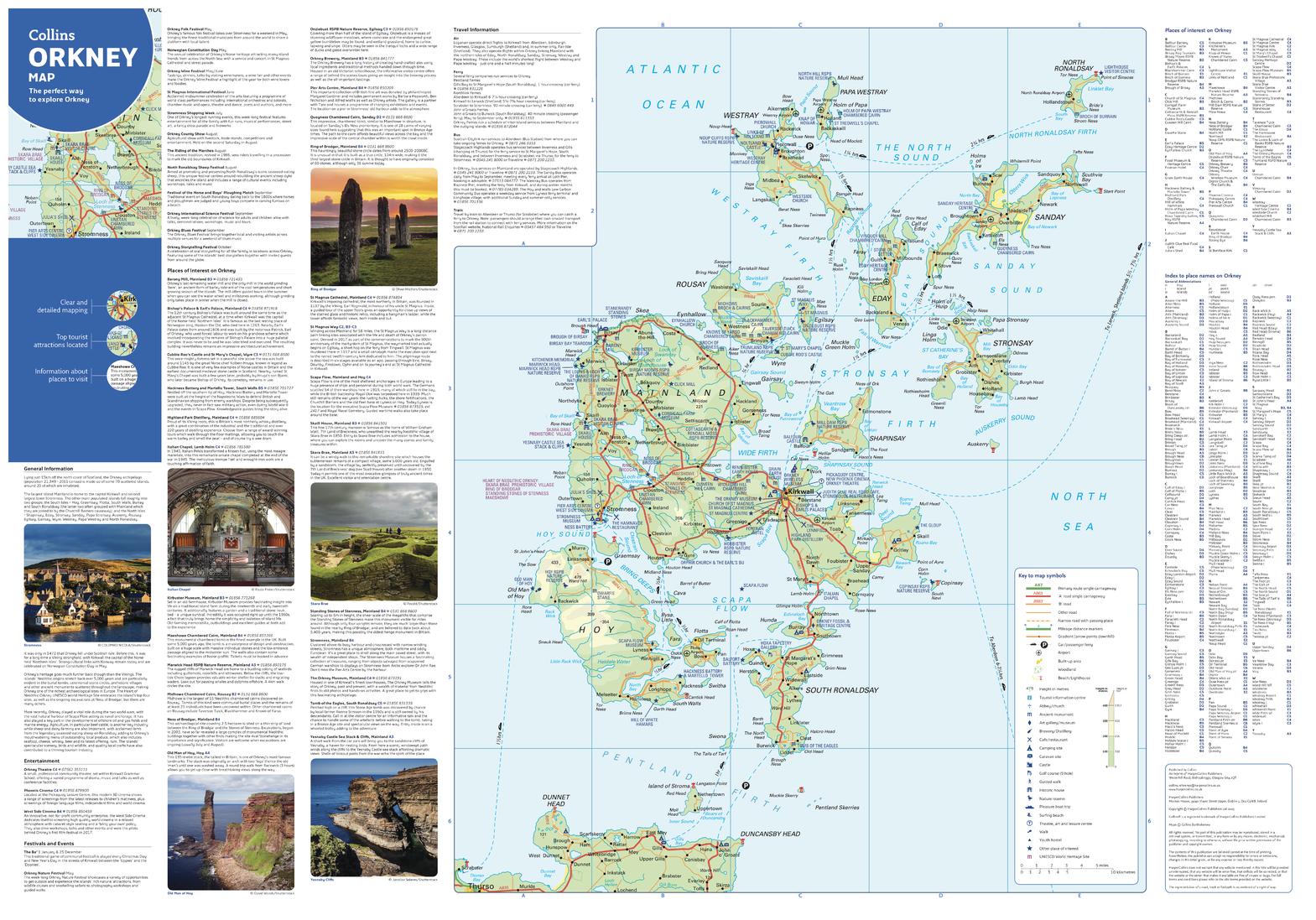 With clear mapping and a high level of detail, explore the Orkney Islands easily with maps from Collins. Information pertains to Orkney mainland, Westray, Sanday, Stronsay, Shapinsay, Hoy, and South Ronaldsay. An ideal guide for tourists and residents alike, this map identifies many tourist attractions, places to stay, cafes, restaurants, and transport links. This is an essential companion or souvenir for anyone visiting the Scotland’s Orkney Isles.