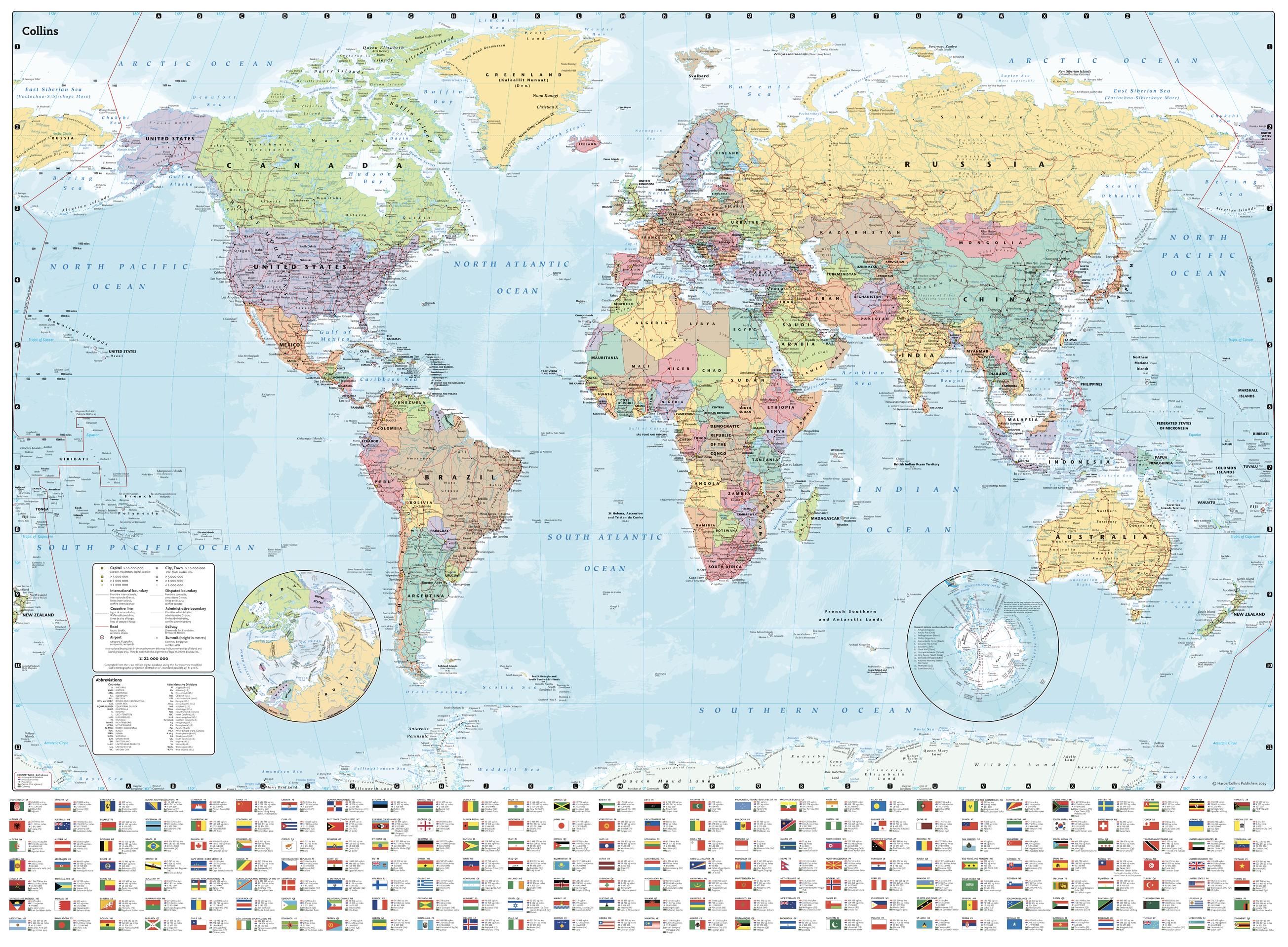 Fully updated world map to include the latest political changes. The map contains politically coloured mapping which shows each country and their capital city, major roads, railways and cities and towns clearly. Also included are national flags, key statistics for every country and inset maps of the polar regions. Great poster for any classroom, bedroom or office wall.