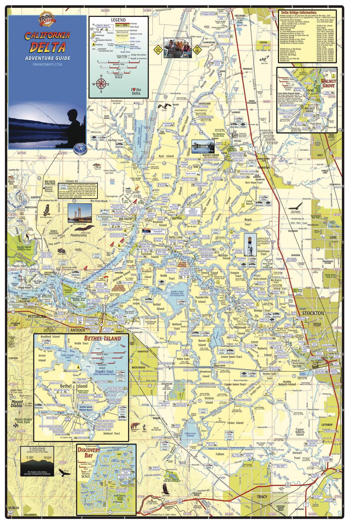 Detailed waterways map of the San Joaquin and Sacramento Rivers. Shows the area from Sacramento on the north to Tracy on the south, and from Stockton on the east to Pittsburg on the west. Insets of Walnut Grove, Bethel Island and Discovery Bay.