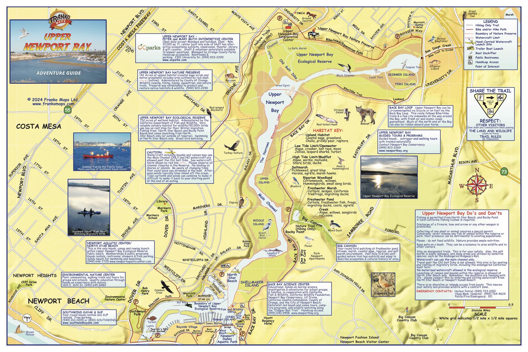 A detailed map of this aquatic and recreational playground. Includes paved bike/hike trails, hiking only trails, trailer boat launches, boat docks/piers, bird watching and preserve information.