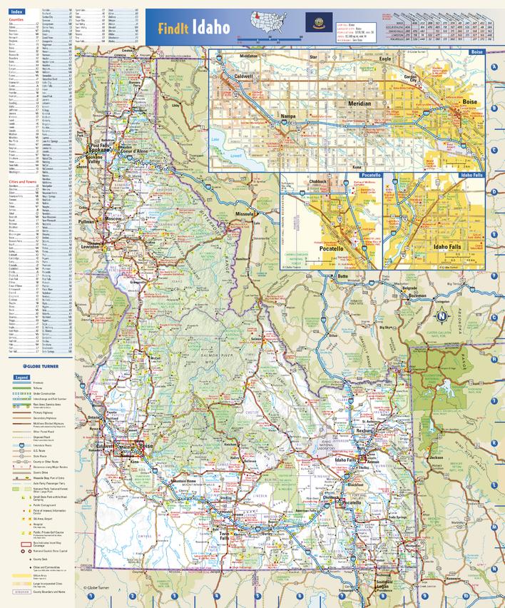 This colorful, easy-to-read state map of Idaho identifies all major thoroughfares, secondary roads, freeway interchanges, rest areas, distance markers, landmarks, recreational areas, and more. Shaded relief on the state map provides a three-dimensional sense of Idaho’s topography. Detailed inset maps of Boise, Idaho Falls, and Pocatello are based on the latest street information from our cartographic experts. County and city indices make it simple to locate even the smallest town. City type sizes reflect the 2020 U.S. Census.
