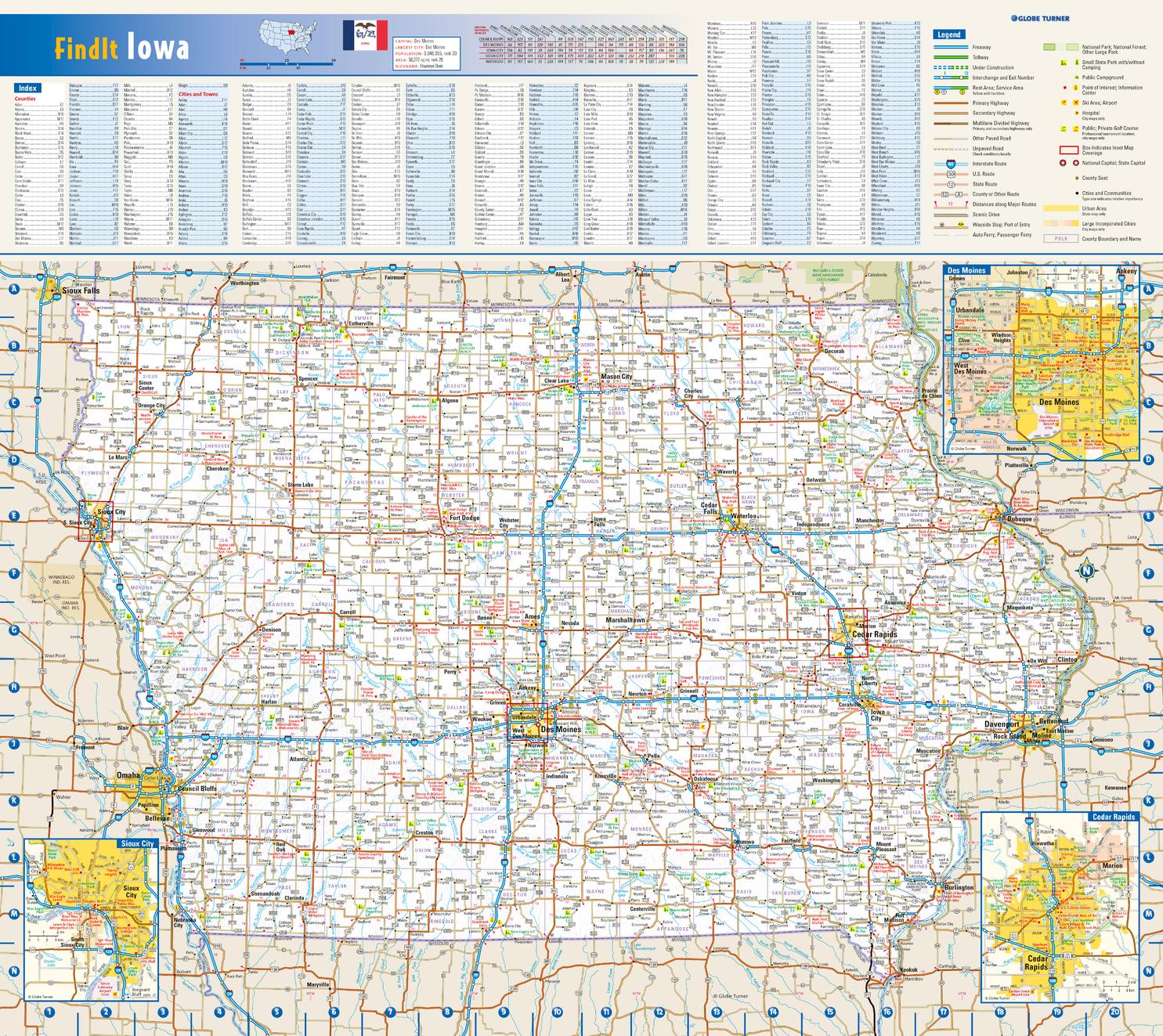 This colorful, easy-to-read state map of Iowa identifies all major thoroughfares, secondary roads, freeway interchanges, rest areas, distance markers, landmarks, recreational areas, and more. Shaded relief on the state map provides a three-dimensional sense of Iowa's topography. Detailed inset maps of Cedar Rapids, Des Moines, and Sioux City are based on the latest street information from our cartographic experts. County and city indices make it simple to locate even the smallest town.