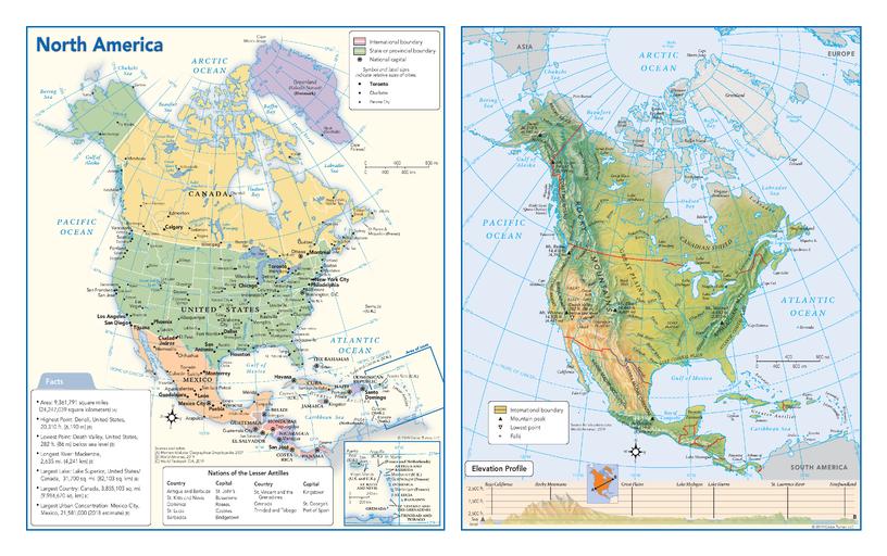 This map of the North American continent combines two maps in one - a vivid political map of North America showing all of the countries and major cities as well as a colorful topographic physical map depicting all of the major physical features in North America, including a cross-continent elevation profile. The political map includes a call-out box with interesting facts about the continent.