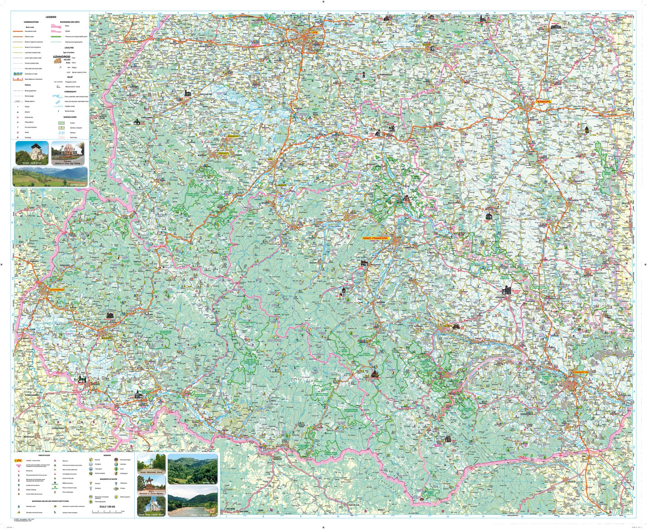 The Carpathian region, a popular holiday destination, is one of the most attractive regions to travel in Ukraine. This map provides information useful to tourists: the most famous historical and cultural, architectural and archaeological monuments, features of nature preservation, museums and spas. Tourist infrastructure and tourist service facilities are listed.
