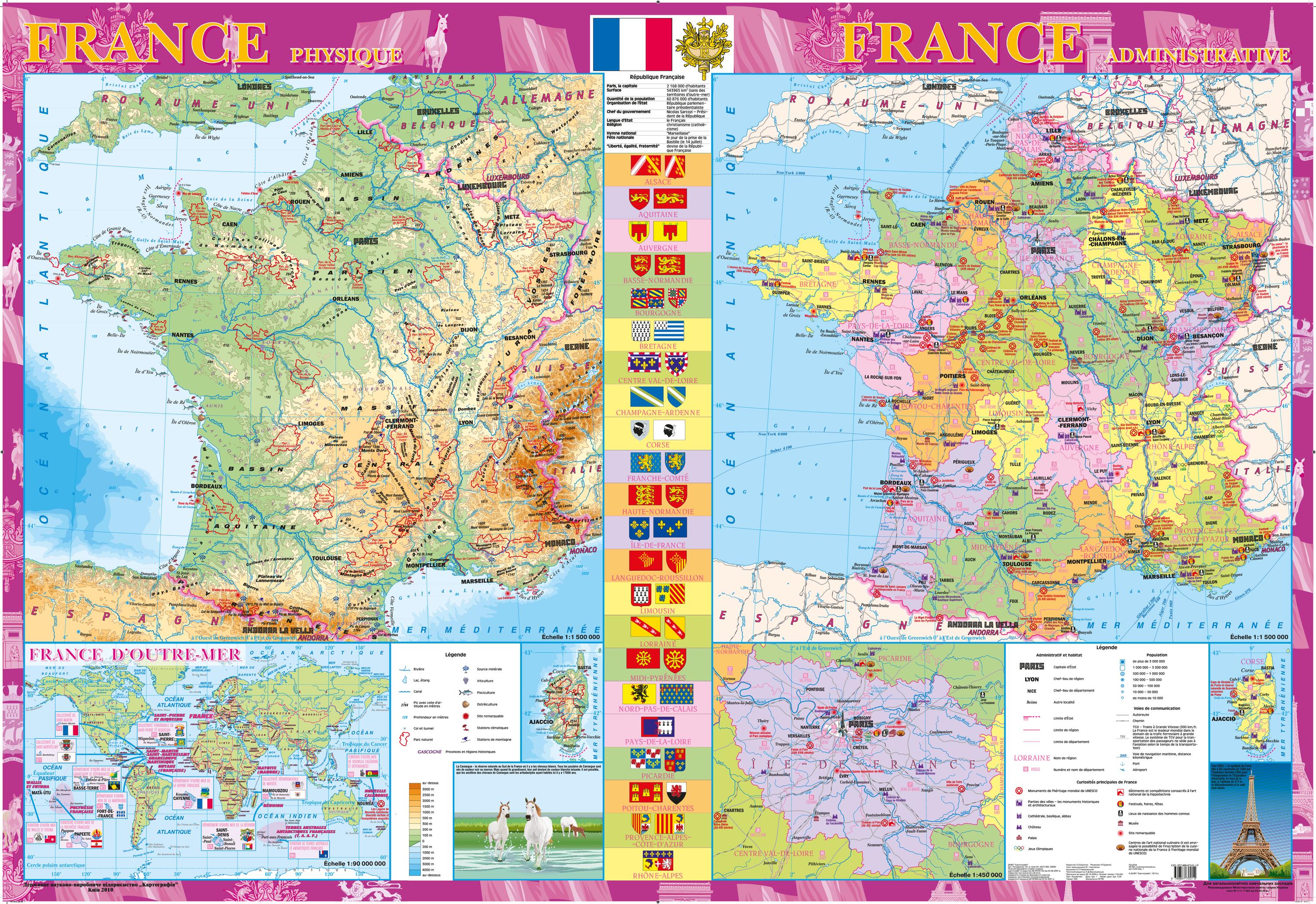 This decorative wall map of France (in French) includes both a physical map “FRANCE physique”, political map “FRANCE administrative”, and an inset map “ILE-DE-FRANCE” (scale of 1:450,000). The French Republic consists of a number of administrative units located outside of the mother country. The overseas possessions of France are shown on the inset map “FRANCE D’OTRE-MER” (scale of 1:90,000,000).