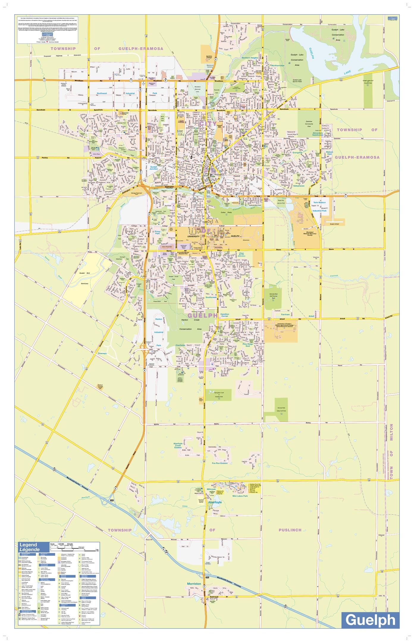 This wall map shows highly detailed local information for the city of Guelph. Full street labeling along with transit information, parks, schools, churches and landmarks throughout the city are displayed.