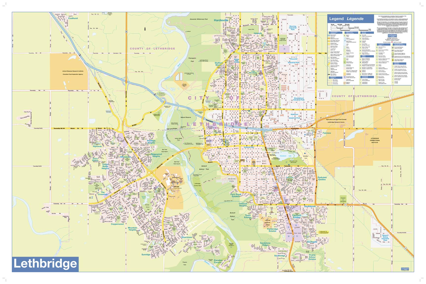 This wall map shows highly detailed local information for the city of Lethbridge. Full street labeling along with transit information, parks, schools, churches and landmarks throughout the city are displayed.