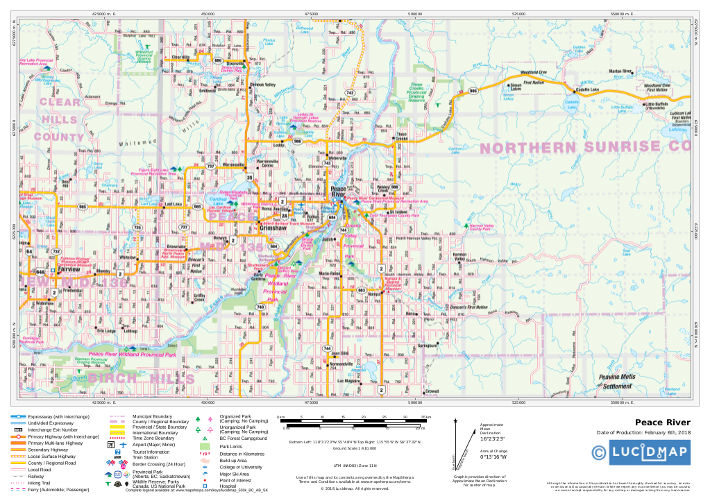 Create custom regional maps in Canada from this series of attractive detailed road maps covering most of the populated areas across Canada. Maps are developed from Lucidmap’s iconic Canadian cartography. Coverage of northern Alberta includes Wood Buffalo National Part in the north-east corner of the map area, Cold Lake Air Weapons Range in the south-east corner, Pine Le Moray Provincial Park in the south-west corner, and Thinahtea North Provincial Protected Area in the north-west corner. Communities in the coverage area include Grand Prairie, Peace River, Dawson Creek, Fort St. John, Fort McMurray and Fort Vermillion. Native scale is 1:500,000.