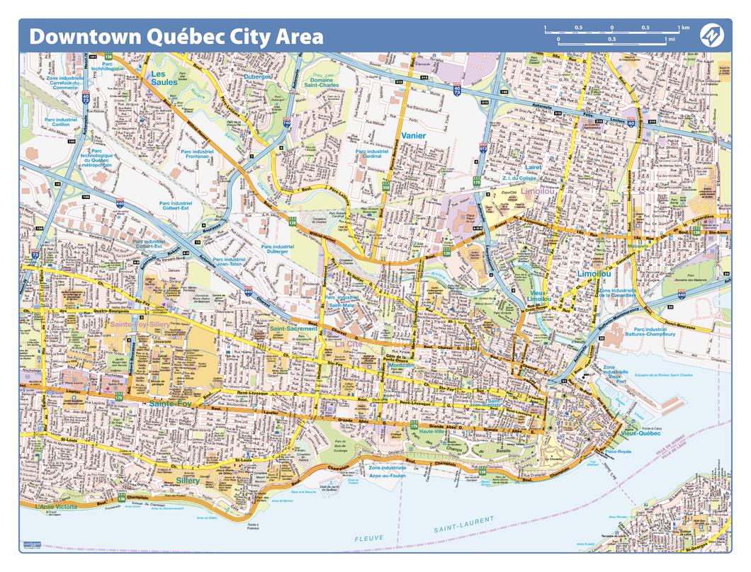 Map of downtown Quebec City showing all roads, road names, political boundaries, transit, points of interest, parks, schools, churches, public buildings and landmarks.Page Size: 21.5 x 16.25 in (546 x 413 mm)