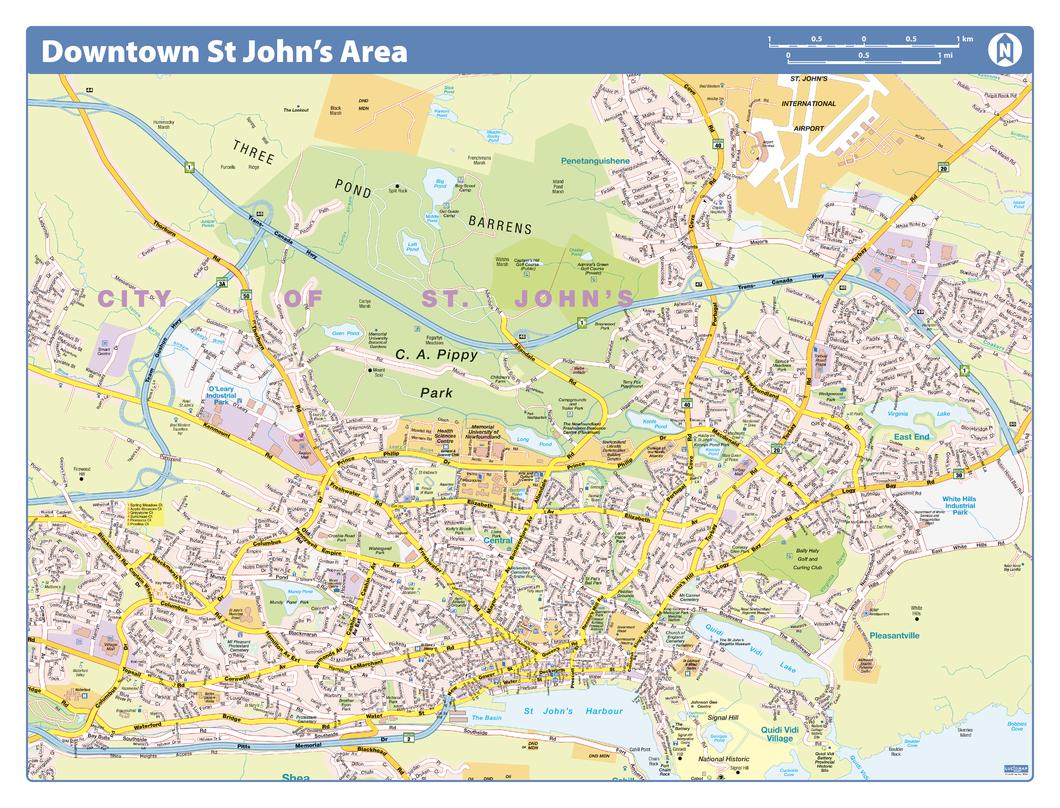 Map of downtown St. John's showing all roads, road names, political boundaries, transit, points of interest, parks, schools, churches, public buildings and landmarks.Page Size: 21.5 x 16.25 in (546 x 413 mm)