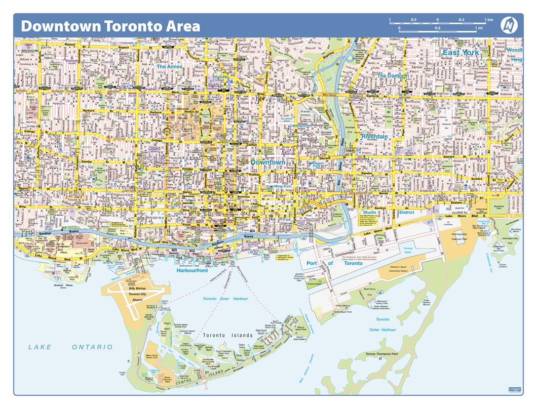 Map of downtown Toronto showing all roads, road names, political boundaries, transit, points of interest, parks, schools, churches, public buildings and landmarks.Page Size: 21.5 x 16.25 in (546 x 413 mm)