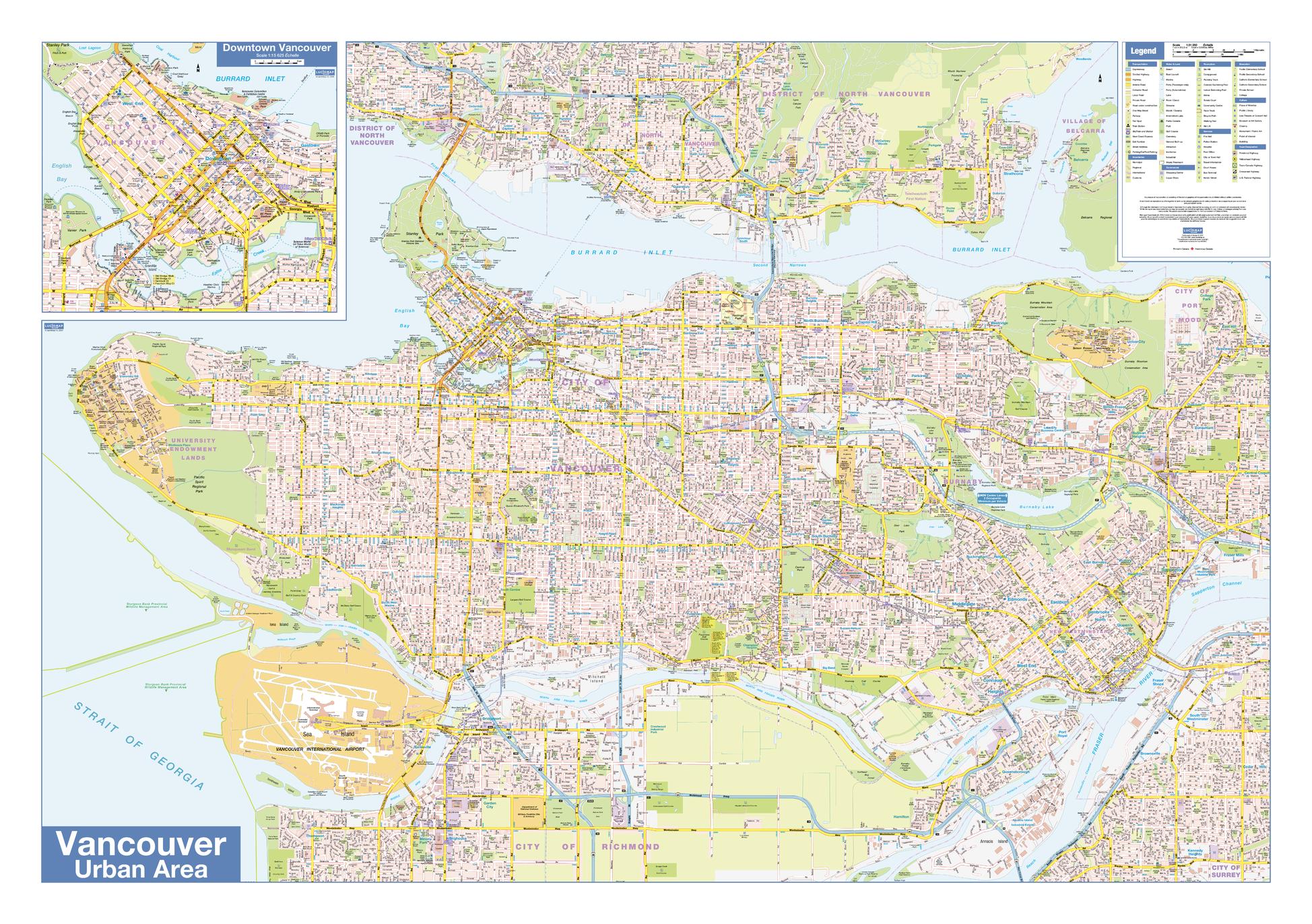 Map of downtown Vancouver showing all roads, road names, political boundaries, transit, points of interest, parks, schools, churches, public buildings and landmarks.