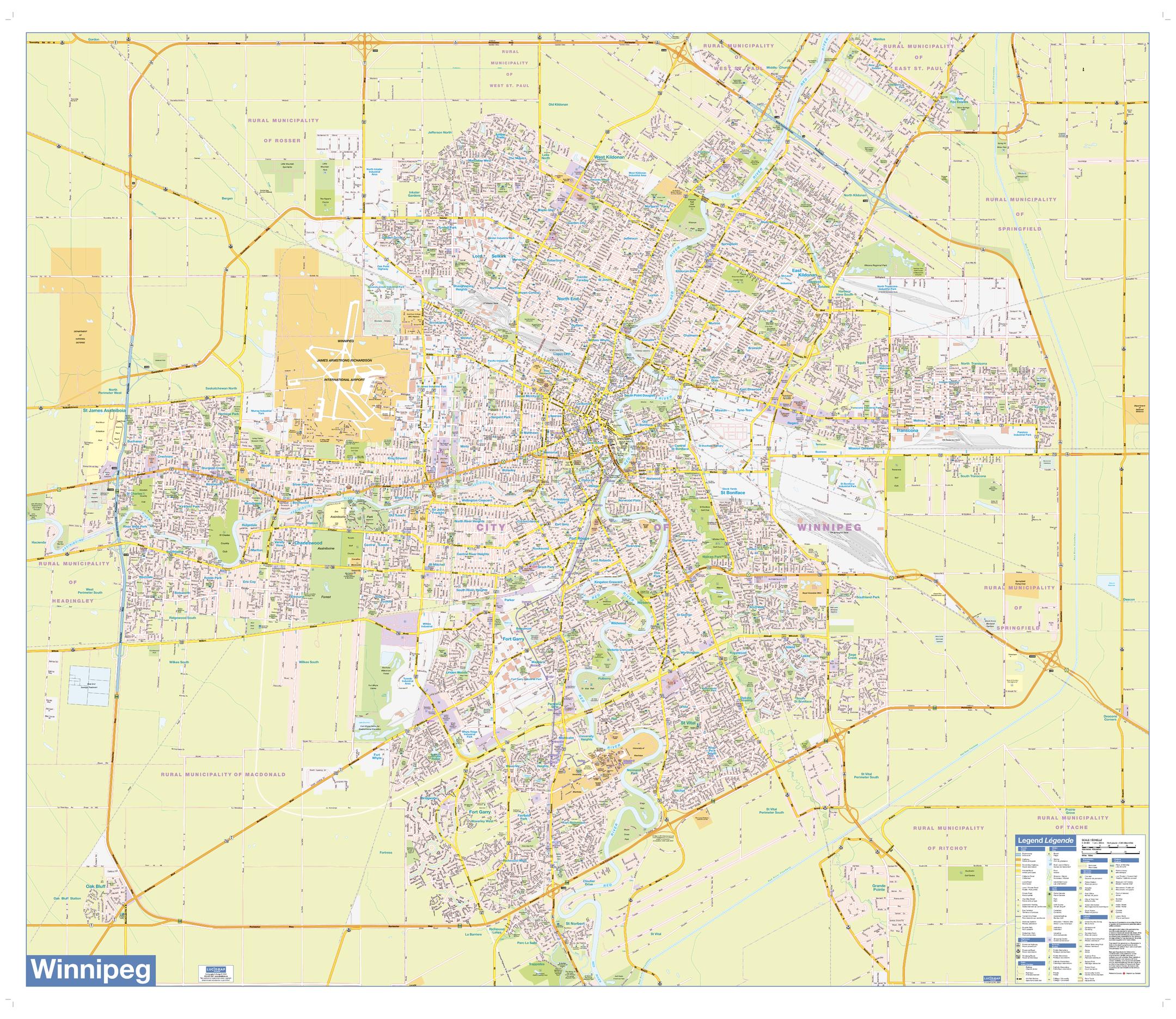 This wall map shows highly detailed local information of the city of Winnipeg. Full street labeling along with transit information, parks, schools, churches and landmarks throughout the city are displayed.