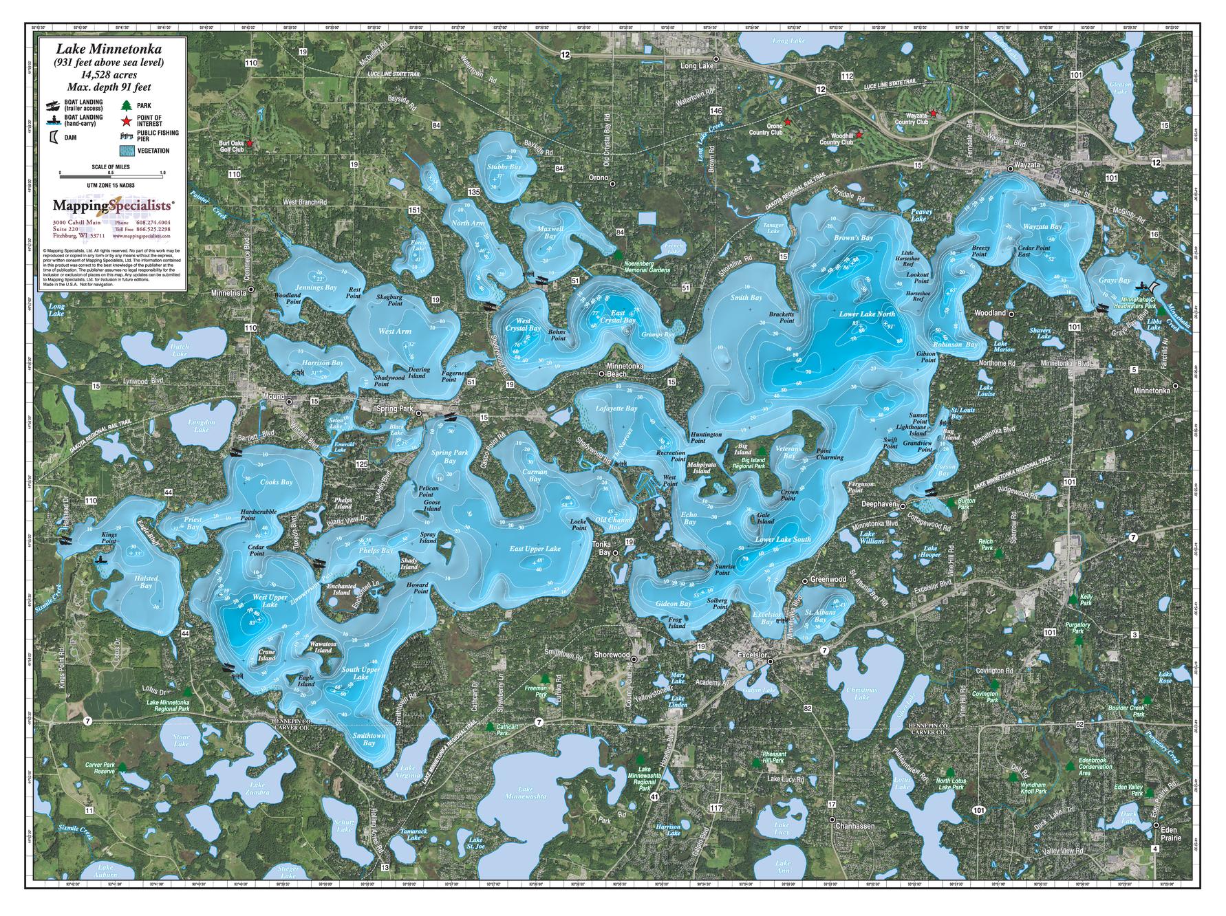 An Attractive map of the lake showing a visual 3D representation of the lake bottom. Includes boat launches, rock area and vegetation. Land area is high resolution aerial imagery.