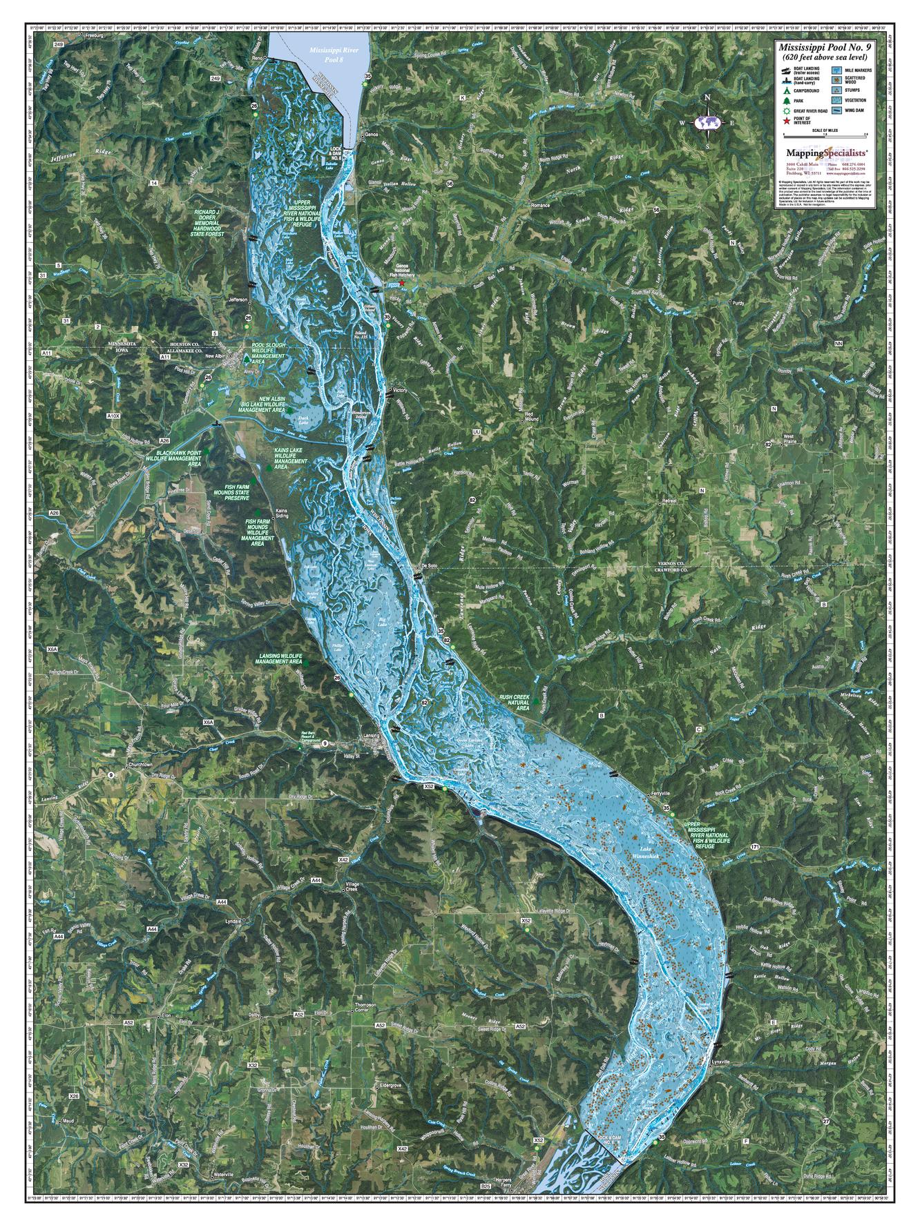 An Attractive map of the lake showing a visual 3D representation of the lake bottom. Includes boat launches, rock area and vegetation. Land area is high resolution aerial imagery.