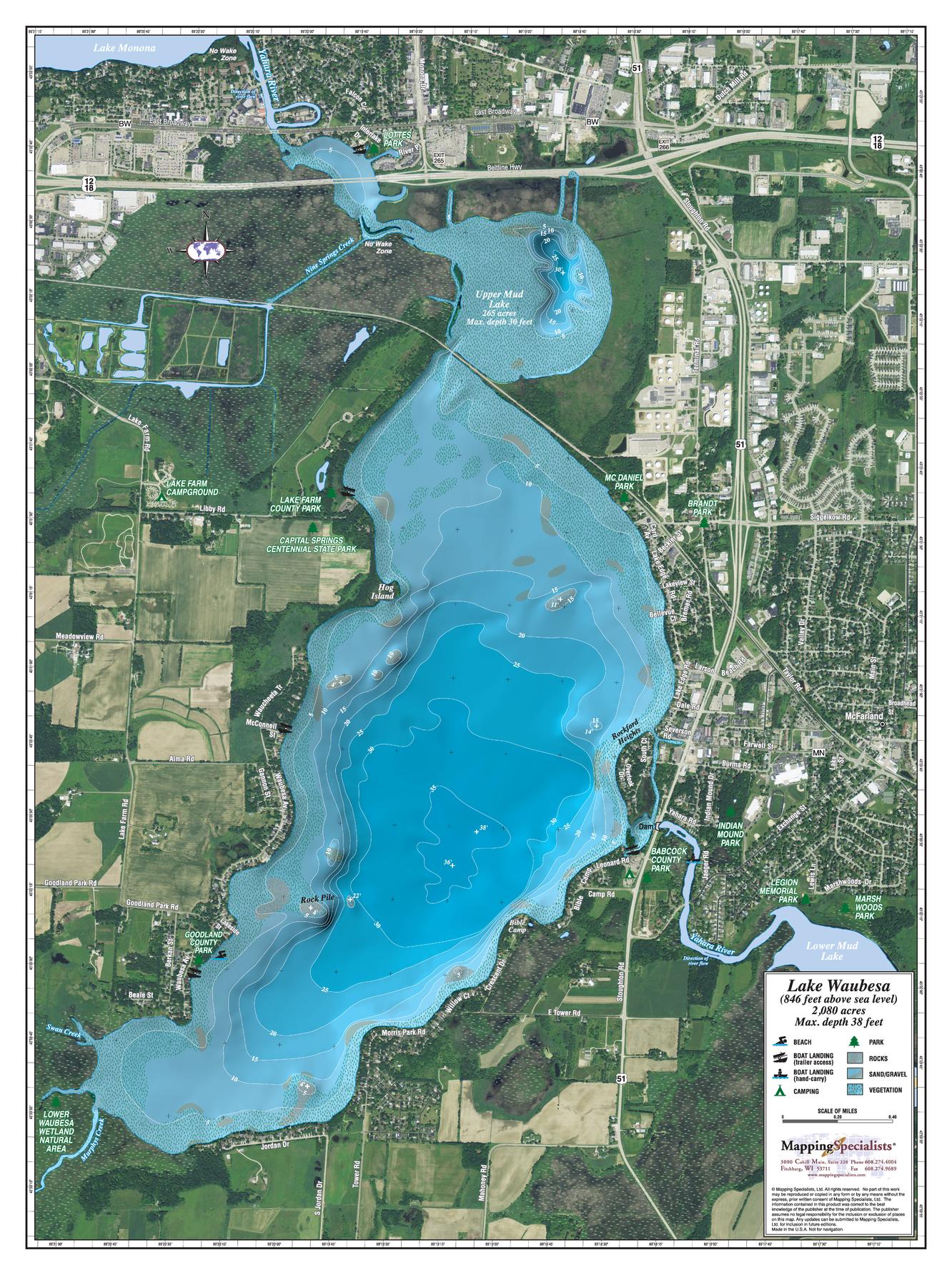 An Attractive map of the lake showing a visual 3D representation of the lake bottom. Includes boat launches, rock area and vegetation. Land area is high resolution aerial imagery.