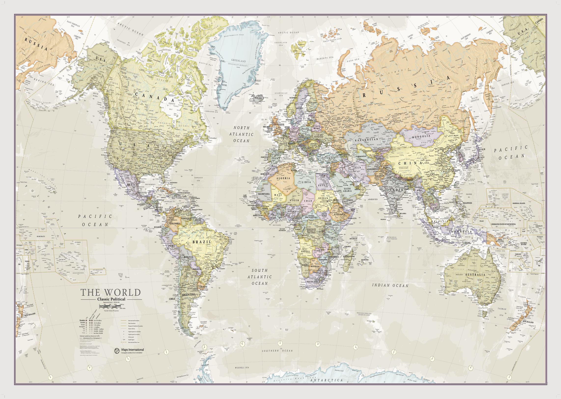 This popular world classic map looks stunning and elegant with its artistic, classic-style muted tones.