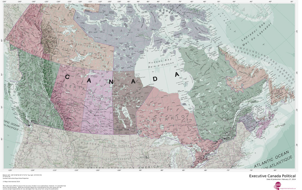 Splendid map of the Canada in muted tones. This Canada map clearly depicts all the cities, major roads and also shows all the Provinces and Territory boundaries. All major cities and areas are displayed bi-lingually.