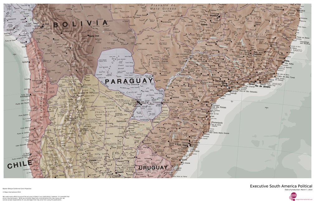 Splendid map of the South America in muted tones. This South America map features countries marked in a different colour, with international boundaries shown.