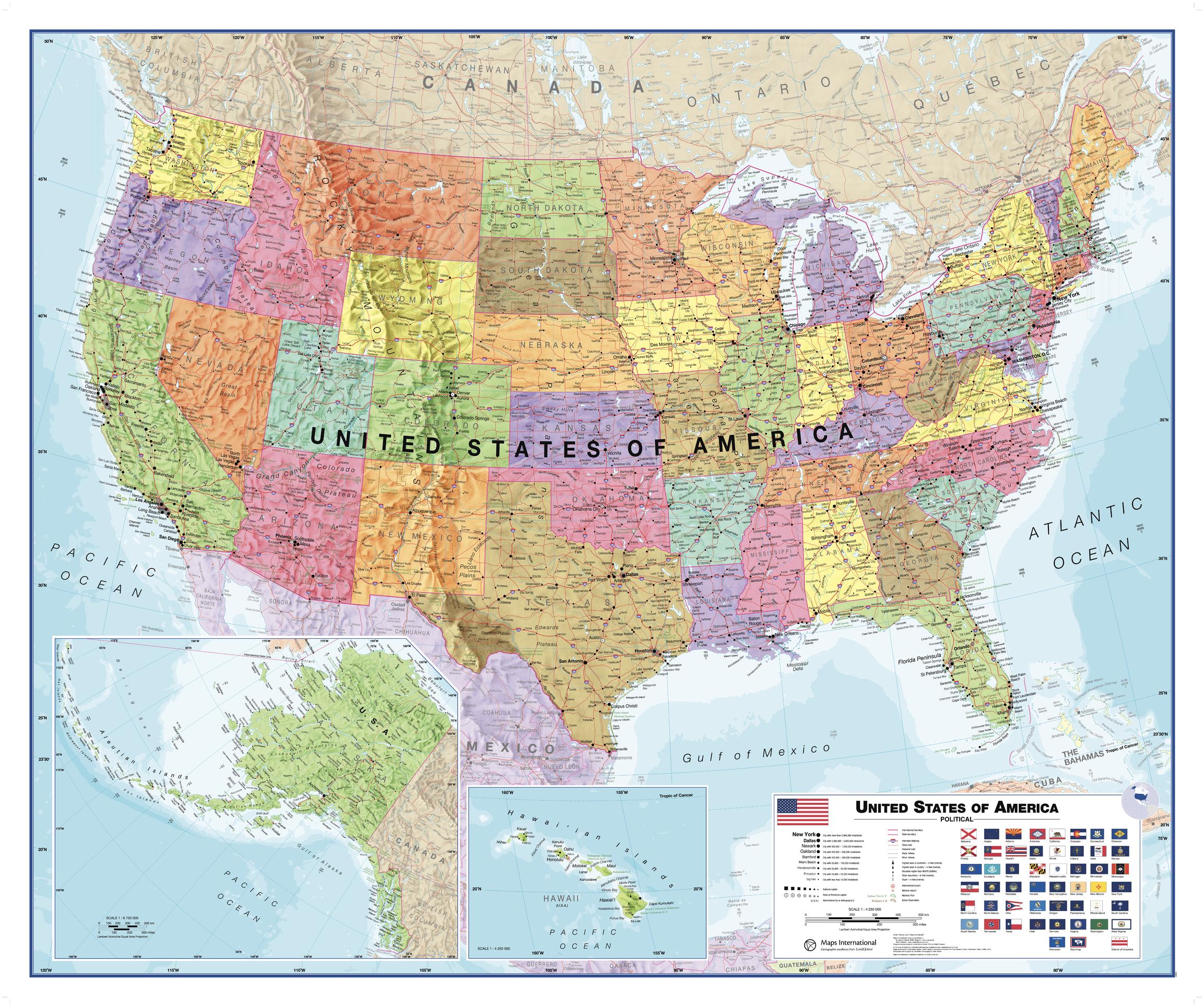 This USA map clearly depicts all the cities, major roads and also shows all the state areas and boundaries. Flags of the States are also displayed. The Map is politically up to date with cartographic changes.