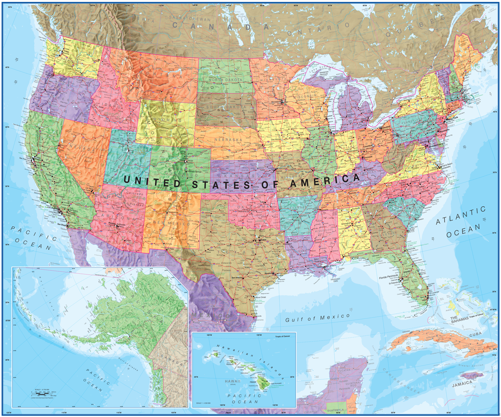 This USA political map clearly depicts all the cities, major roads and also shows all the state areas and boundaries.
