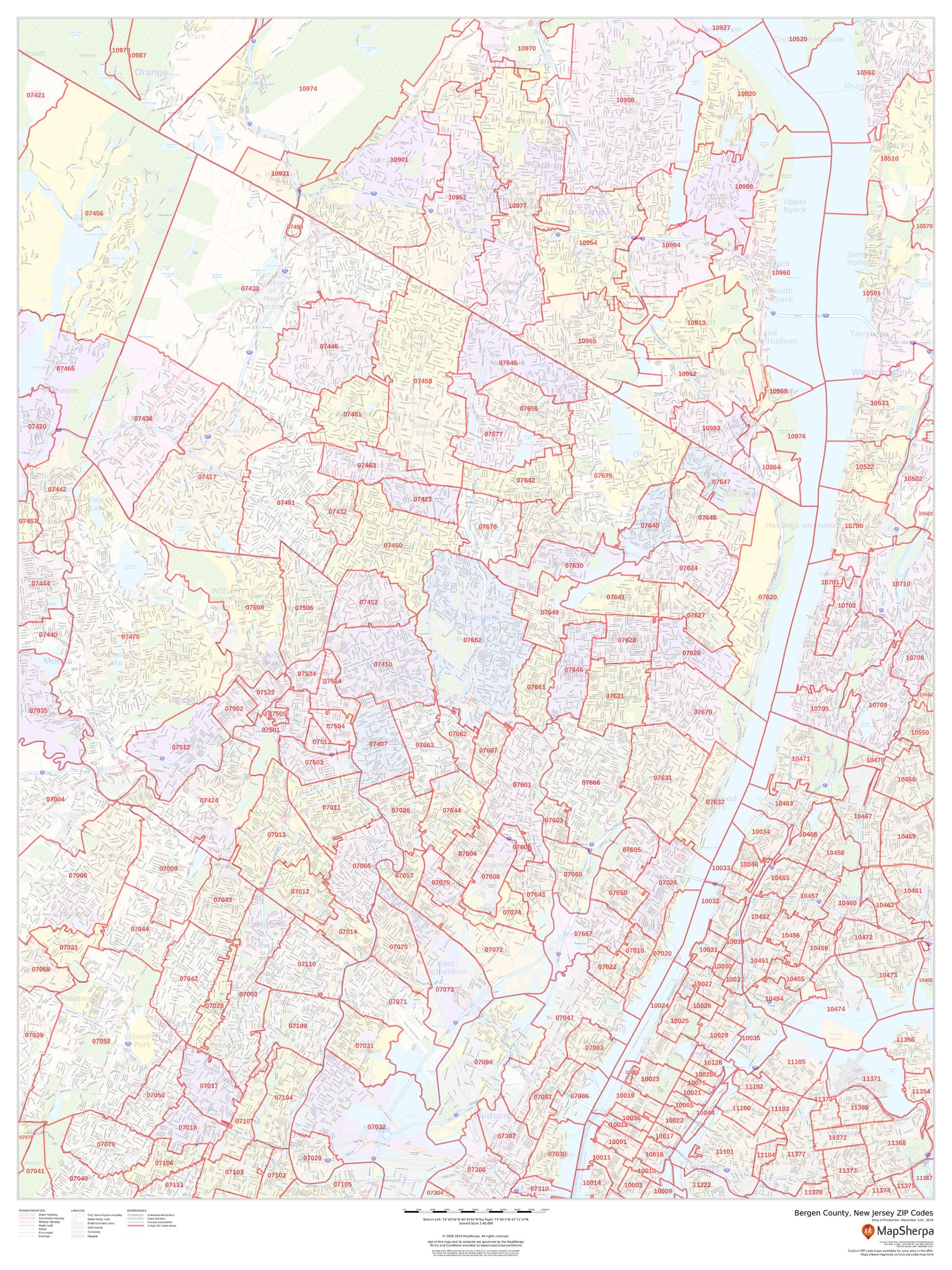 This map of Bergen County, New Jersey shows ZIP code areas overlaid on a road map. Ideal for planning of deliveries, home ervices, sales territories, real estate and much more. Base map features include all roads with major roads and highways labelled; neighborhood names; railways; and high level land use such as parks and recreation areas, industrial areas and hospital campuses.