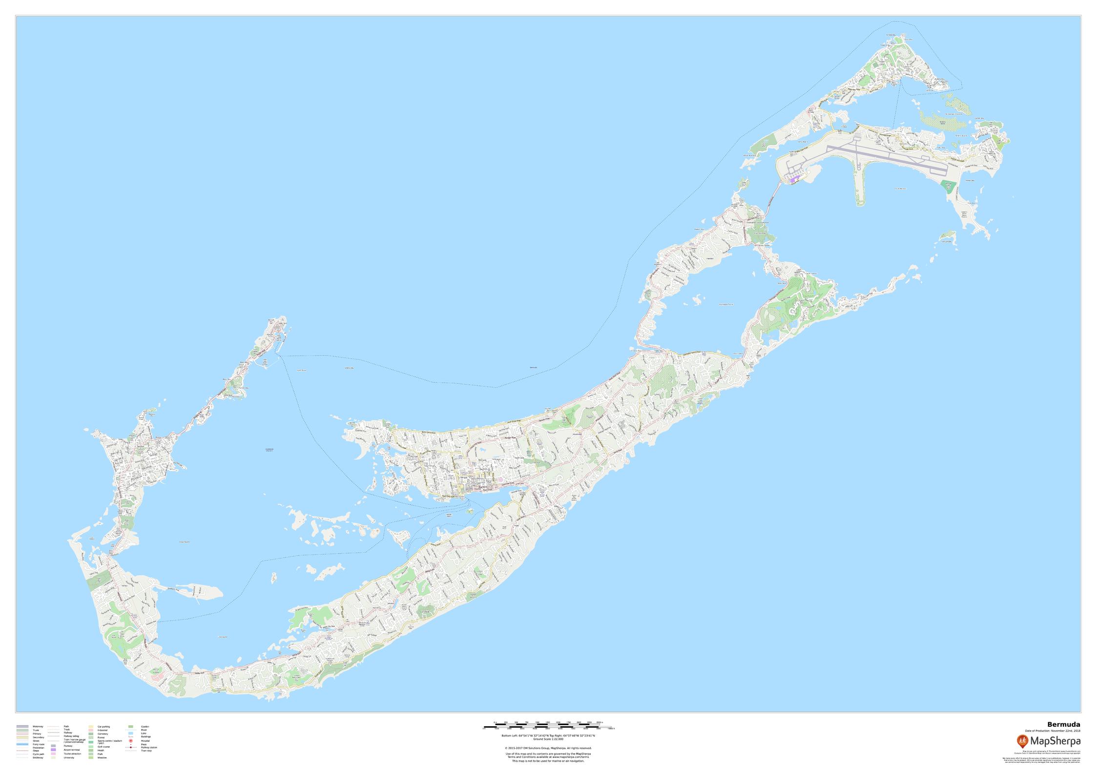 This map of Bermuda features a full road network for the island including the capital Hamilton, walking paths, land use, points of interest, and many of the buildings. Useful for the traveller, and as a wall map for display in your home.
