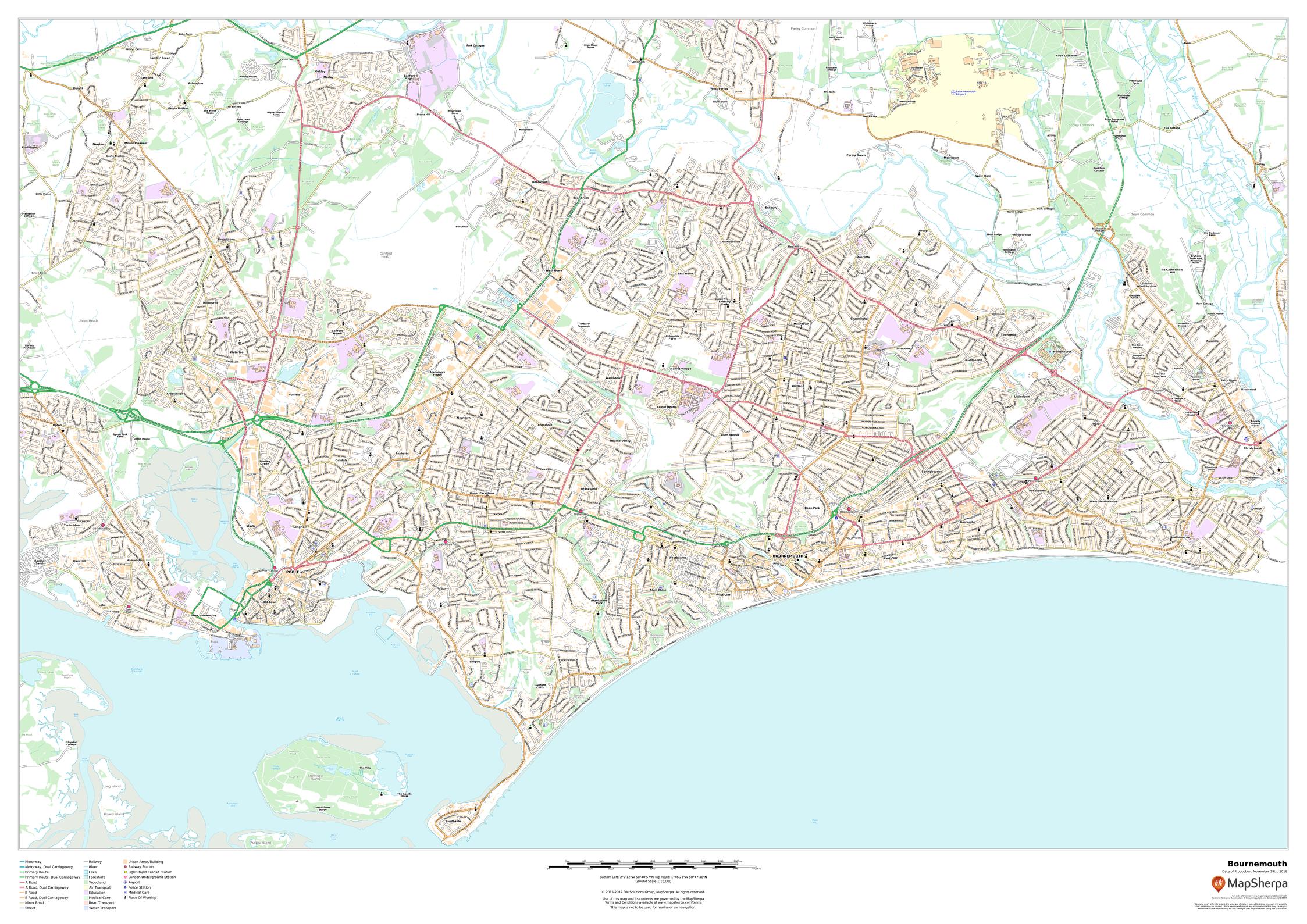 This map of Bournemouth shows detailed street level information including extensive street labelling. Ideal for planning of deliveries, home services, sales territories, real estate and much more.