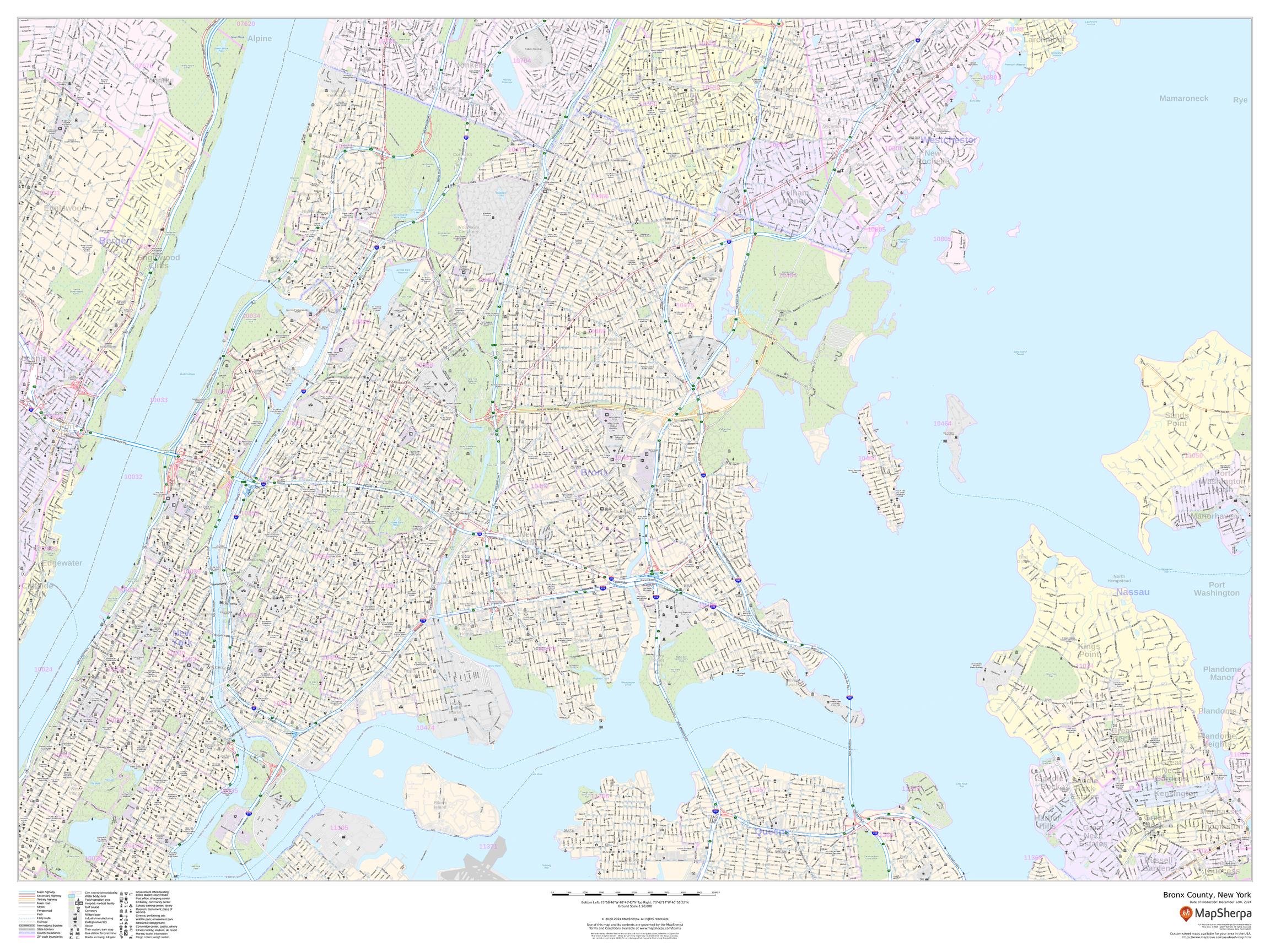 This map of Bronx County, New York shows detailed street level information including extensive street labeling. Ideal for planning of deliveries, home services, sales territories, real estate and much more. Base map features include all roads with major roads and highways labelled; neighborhood names; railways; high level land use such as parks and recreation areas, industrial areas and hospital campuses; and a variety of points of interest including schools, libraries, stadiums, museums, border crossings and more. ZIP code boundaries are shown as a secondary map feature.