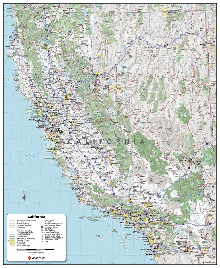 This detailed wall map of California is perfect for both educational and business purposes. The easy-to-read map features vibrant colors and clear labeling of cities, counties, highways, and geographical features. All national and state highways that connect the state are all clearly labelled on the map, while the legend notes the different road and land use classifications such as urban, park, military, and many more. The boundaries of each county in the state are defined and named clearly. Whether you are a student, teacher, business person or geography enthusiast, this map is a valuable addition to any space.